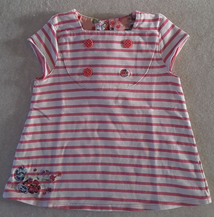 Robe sans manches, à rayures roses et blanches, en bon état. Marque : Kenzo Kids Taille : 2 ans / 86 4 boutons en décoratifs sur le devant de la robe et des fleurs en bas. Fermeture arrière avec 3 boutons pressions. L’aspect légèrement bouloché témoigne de son usage et peut facilement disparaître à l’aide d’un rasoir. Composition ? L’étiquette a disparu Envoi rapide et soigné