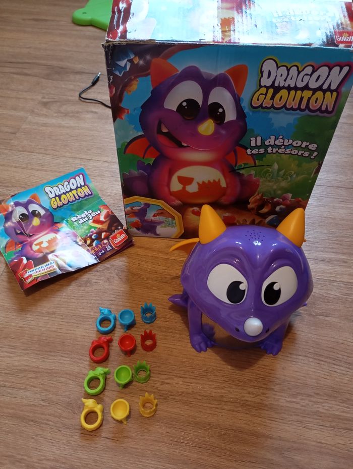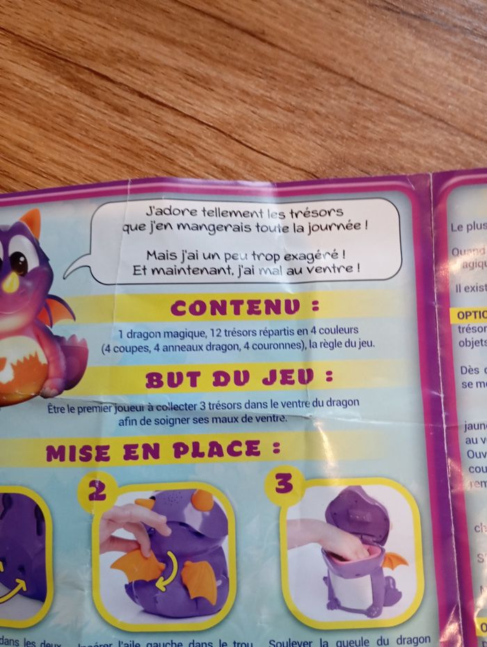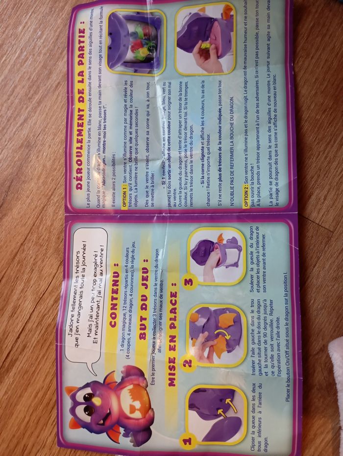 Abracadragon ! Passe la main devant mon visage ! Magique § !Mon ventre s’illumine ! Retiens les couleurs ! Essaye de trouver le trésor de la même couleur que ma corne ! Si tu parviens, tu peux le conserverez ! Remporte 3 trésors et c’est gagné ! Complet, en parfait état de fonctionnement et fourni avec des piles. Possible remise en main propre sur Le Mans.