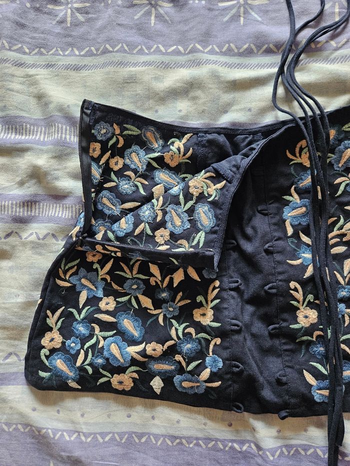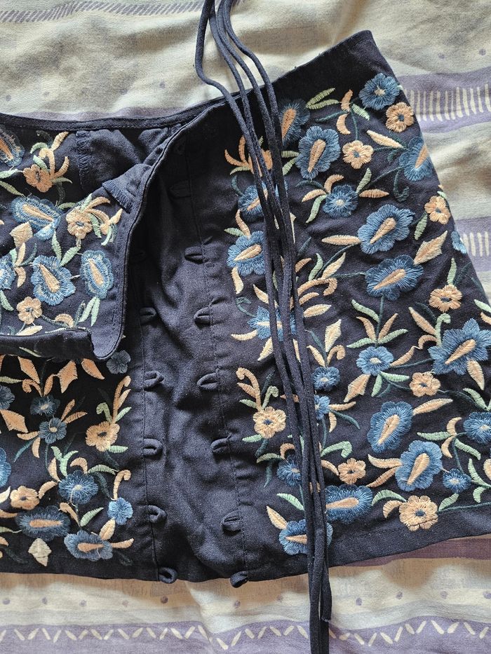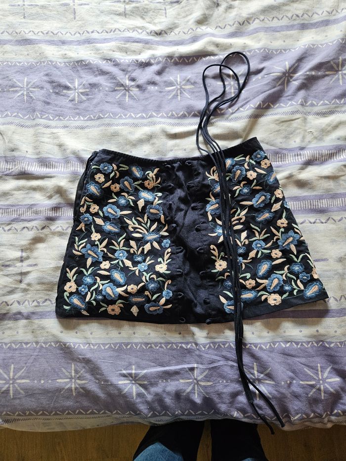 Jupe fond bleu marine, détail lasage devant et dos Fermeture éclair à droite