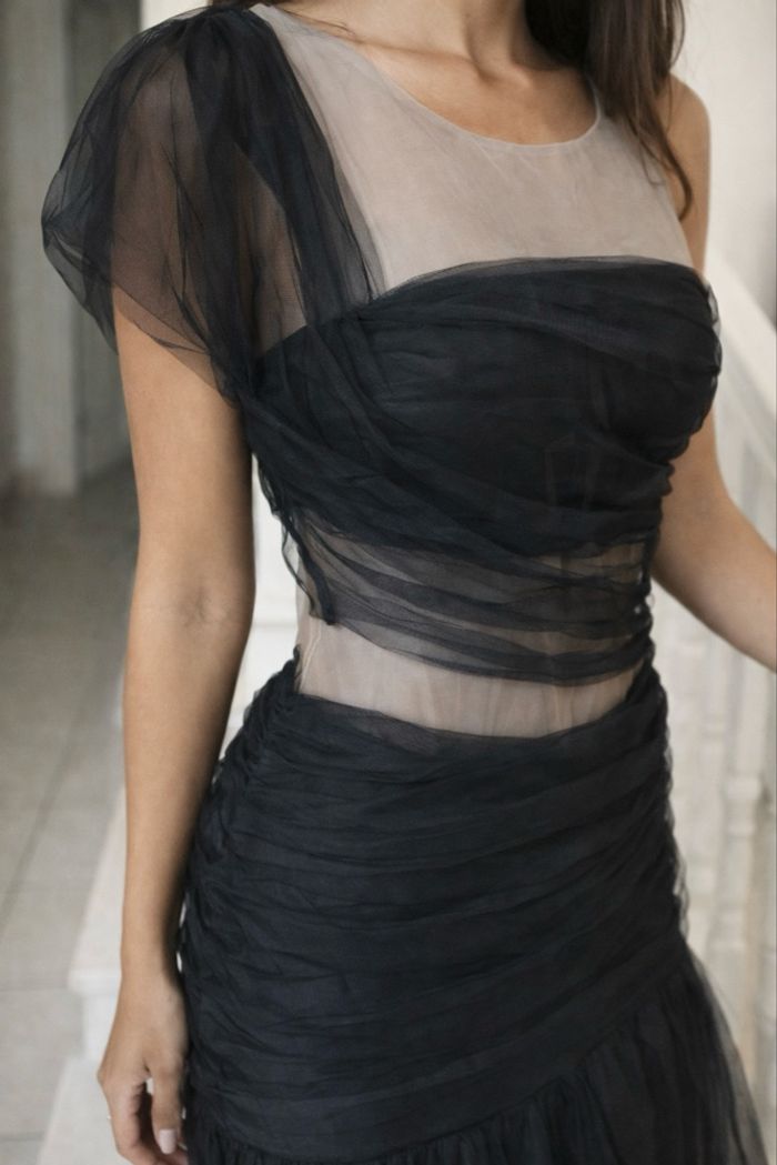 Décolleté illusion avec un drapé asymétrique en tulle fin. Une petite manche bouffante vaporeuse sur une épaule. Coupe ultra-ajustée avec jeux de fronces horizontales qui sculptent la silhouette. Effet "cut-out" visuel au niveau de la taille laissant apparaître la doublure nude. Jupe évasée à partir du milieu des cuisses (style drop waist), composée de plusieurs épaisseurs de tulle pour un mouvement aérien et volumineux. Longueur totale 160 cm