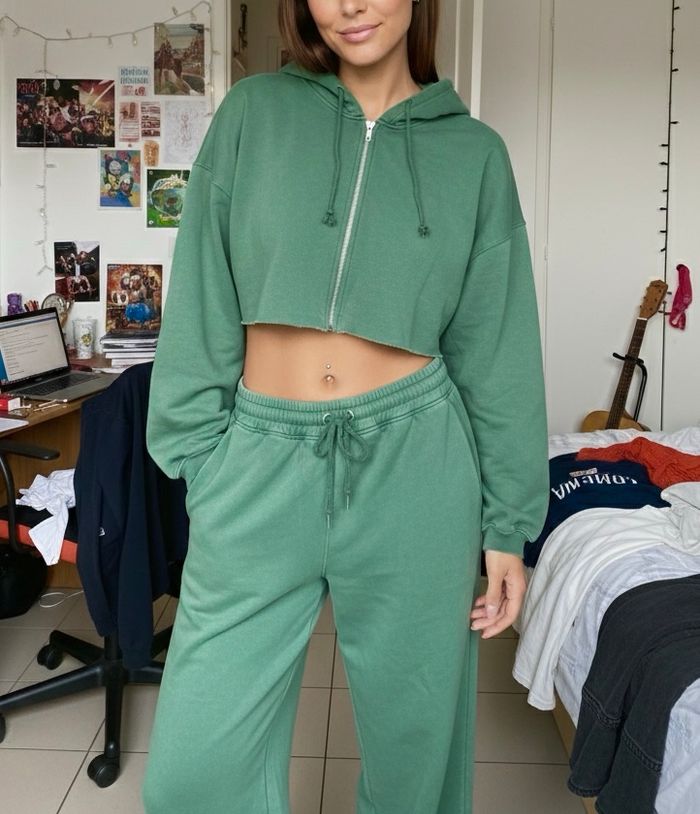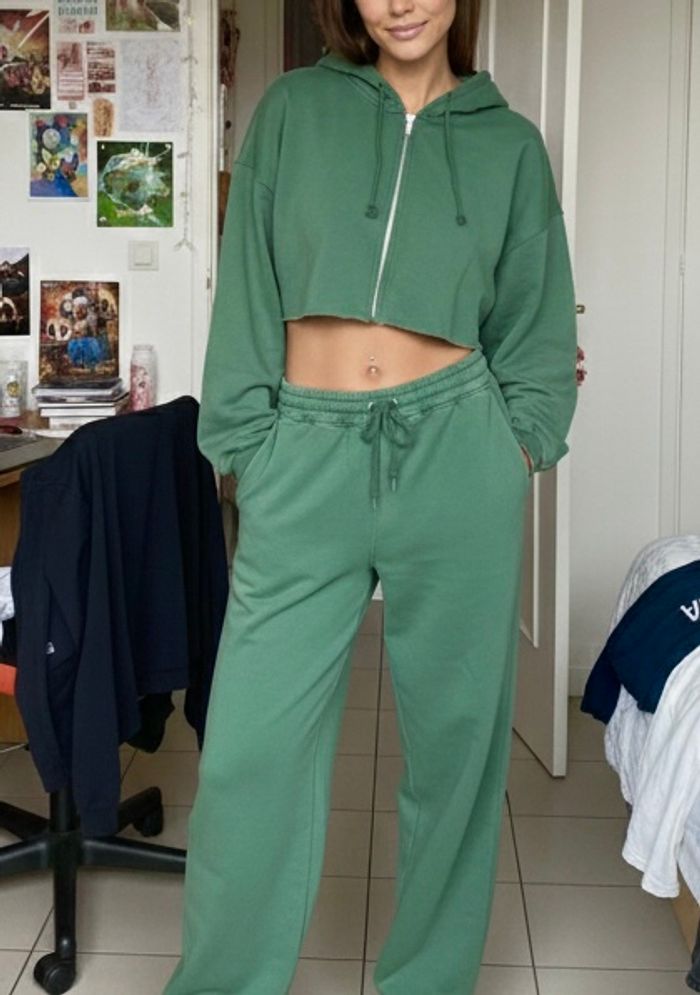 Détails de l'article : • Haut : Sweat à capuche (hoodie) crop top avec fermeture éclair intégrale. Finition bord franc (raw hem) pour un look urbain. • Bas : Pantalon de jogging assorti, coupe jambes larges (wide leg). Taille élastique avec cordon de serrage réglable. • Matière : Doux et agréable à porter (intérieur type molleton). Largeur aisselle à aisselle : environ 58 cm. Longueur totale : environ 104 cm.