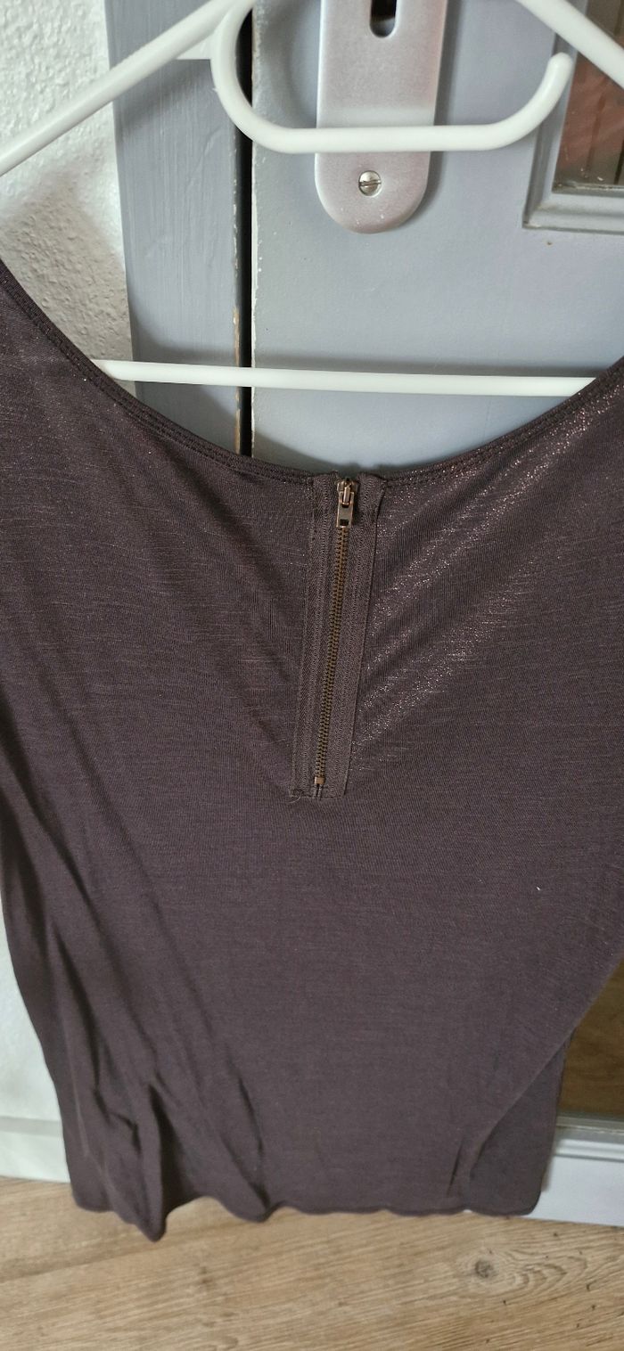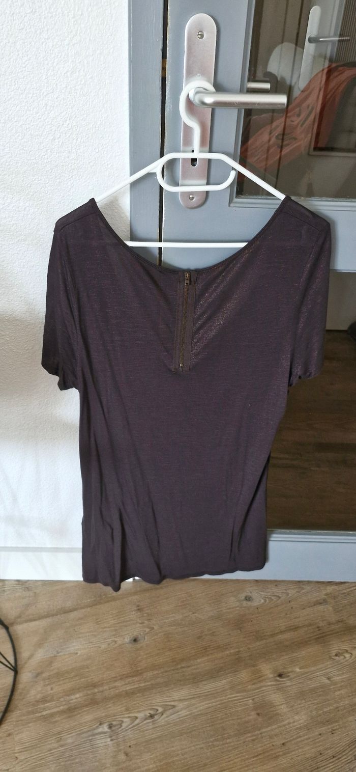 Tee shirt marron pailleté, porté quelques fois, fermeture dans le dos ,taille 4