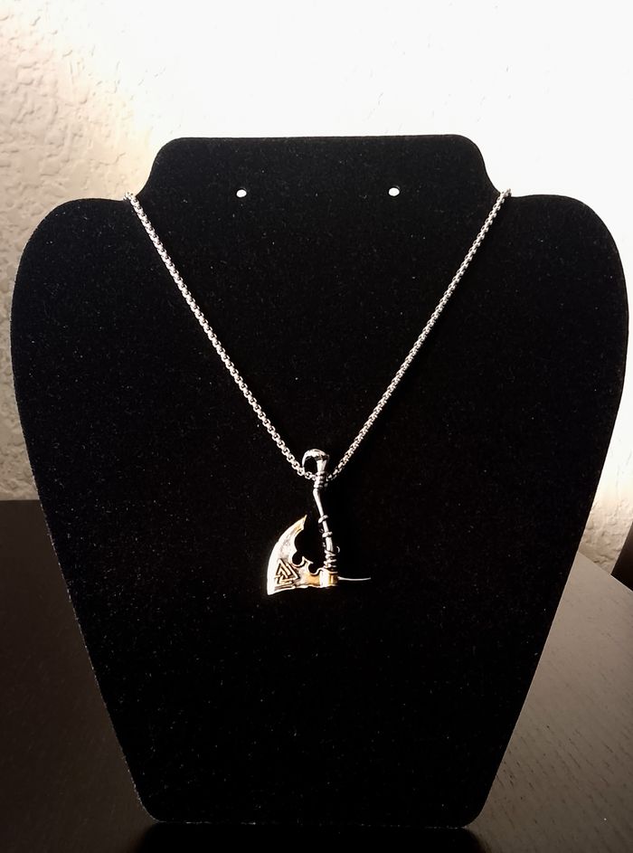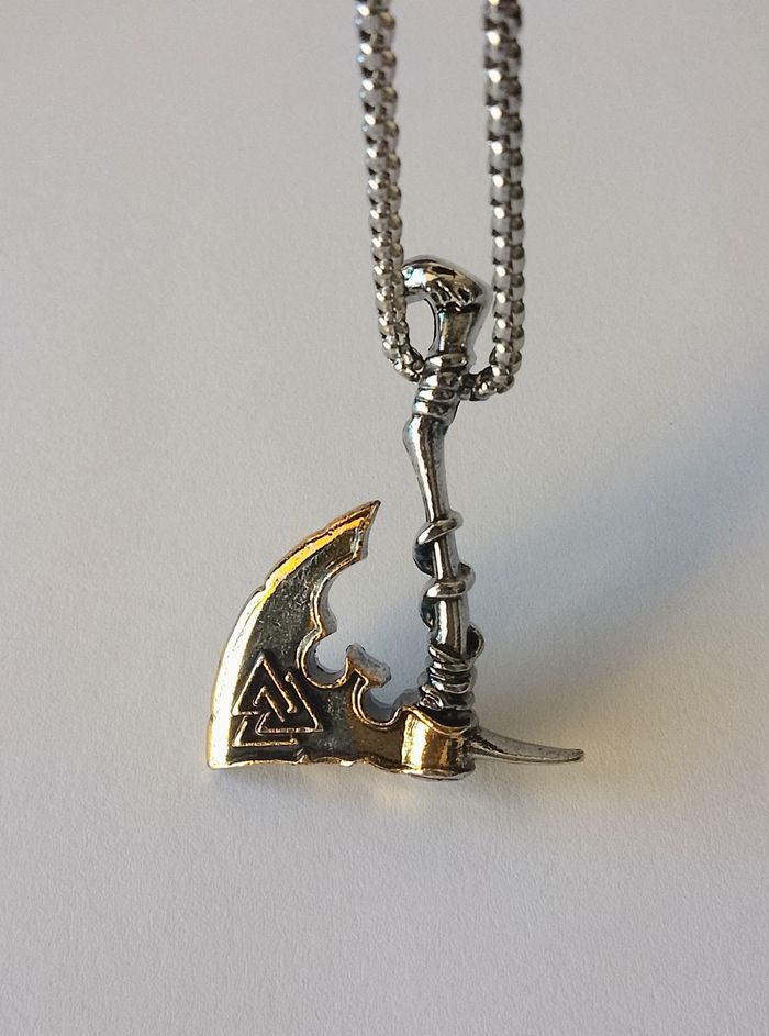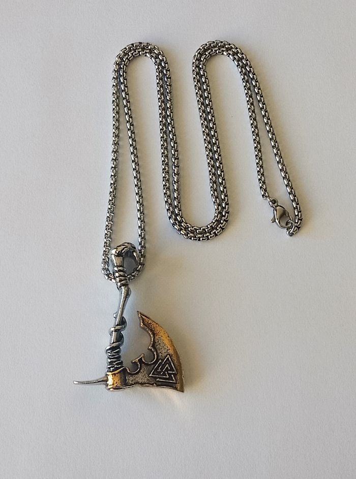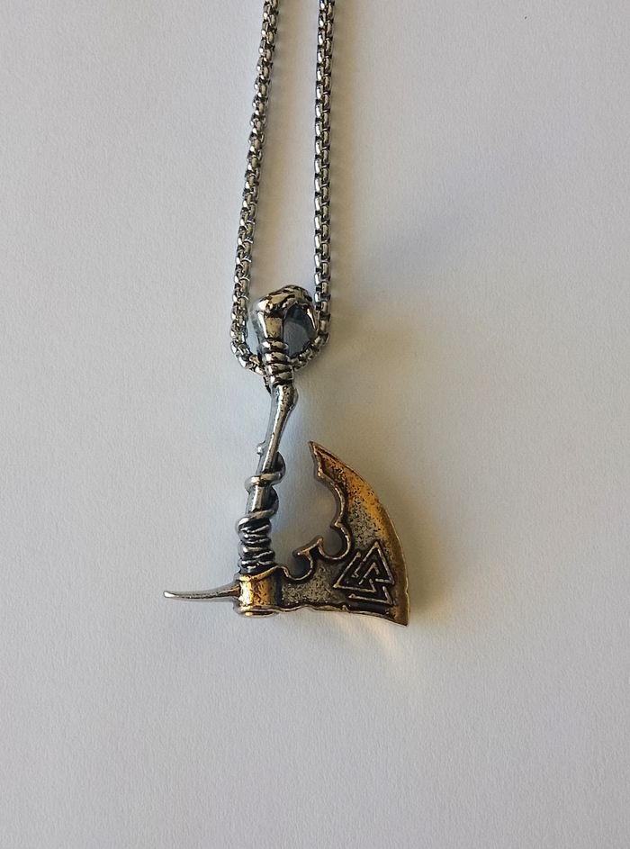 Chaîne + pendentif viking. Pendentif : tomahawk, motif: valknut. (Viking, protection, spirituel, celtique, idéal cadeau) DESCRIPTIF : Les deux faces sont identiques. Couleur : argenté, doré. Taille chaîne : 60 cm Diamètre pendentif : 3,3 cm L * 4,3 cm H. Envoi rapide et soigné.