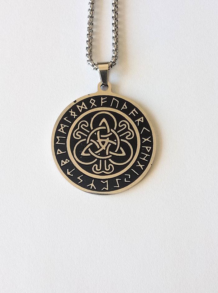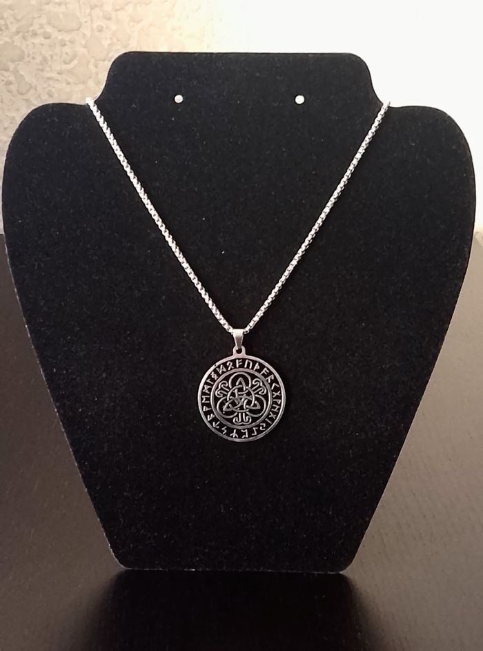 Chaîne + pendentif viking. Motif : runes, nœud celtique trinité. (viking, celtique, protection, spirituel, idéal cadeau) DESCRIPTIF : Couleur : noir, argenté. Taille chaîne : 60 cm Diamètre pendentif : 3,5 cm L * 3,8 cm H. Envoi rapide et soigné.