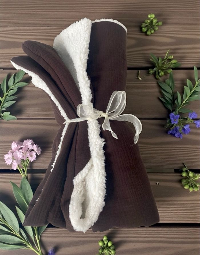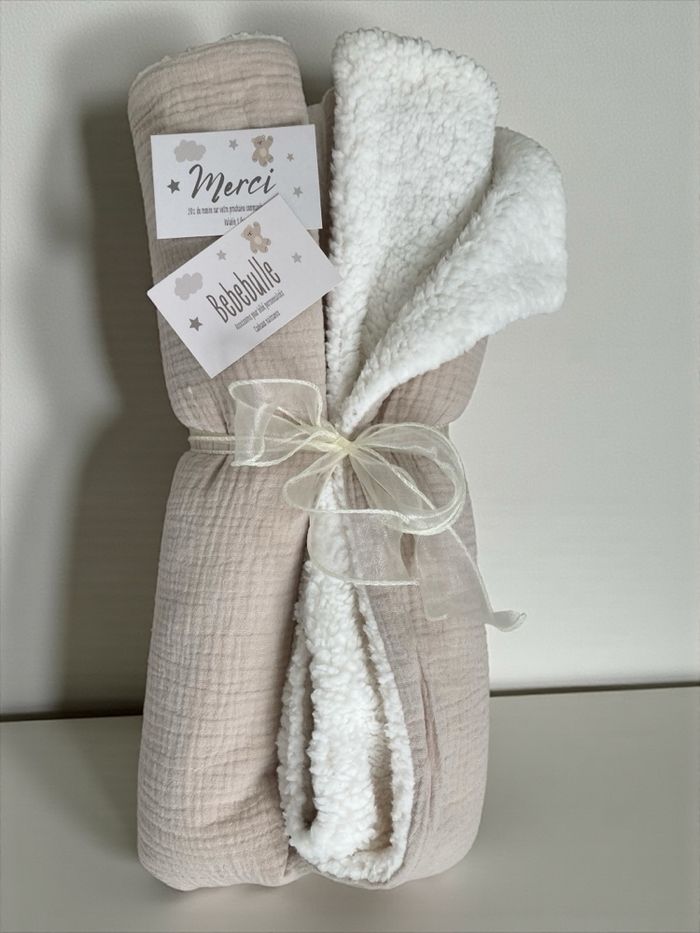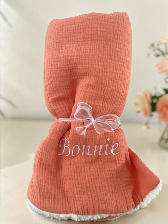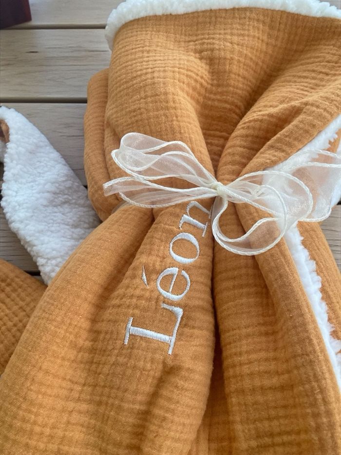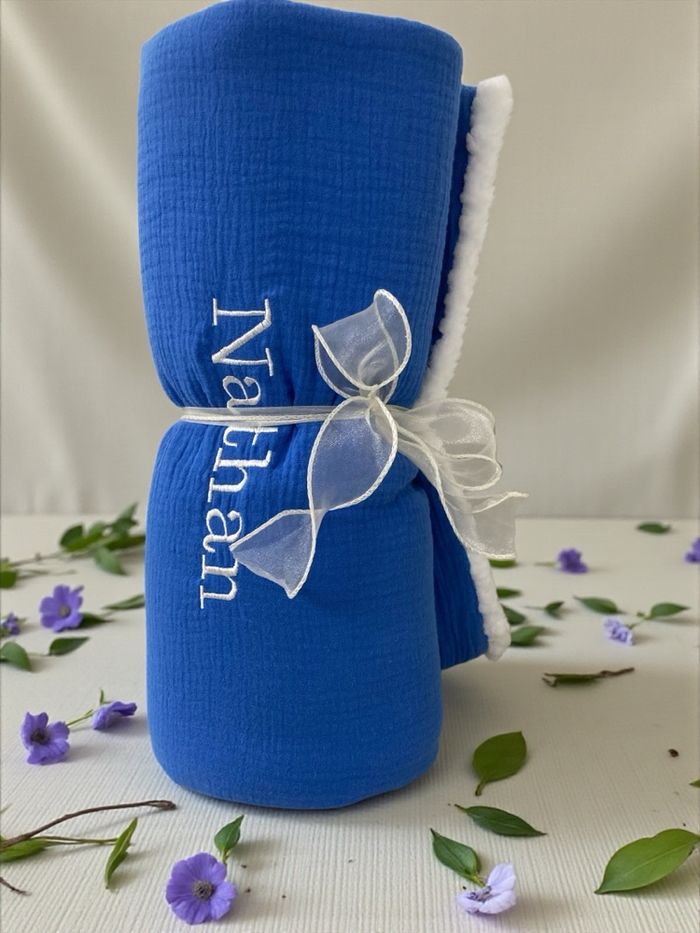 Couverture personnalisée, entièrement conçue en tissus certifiés Oeko-Tex, garantis sans substances nocives. • Dimensions : 90 x 90 cm • Face uni : double gaze de coton, douce et légère • Face arrière : Sherpa moumoute ultra-douce et chaleureuse • Personnalisation : broderie du prénom au choix • Large choix de couleurs : • Couverture : 21 couleurs • Broderie : plus de 80 couleurs Chaque couverture est réalisée avec soin, idéale pour les bébés, enfants ou comme cadeau unique et personnalisé.
