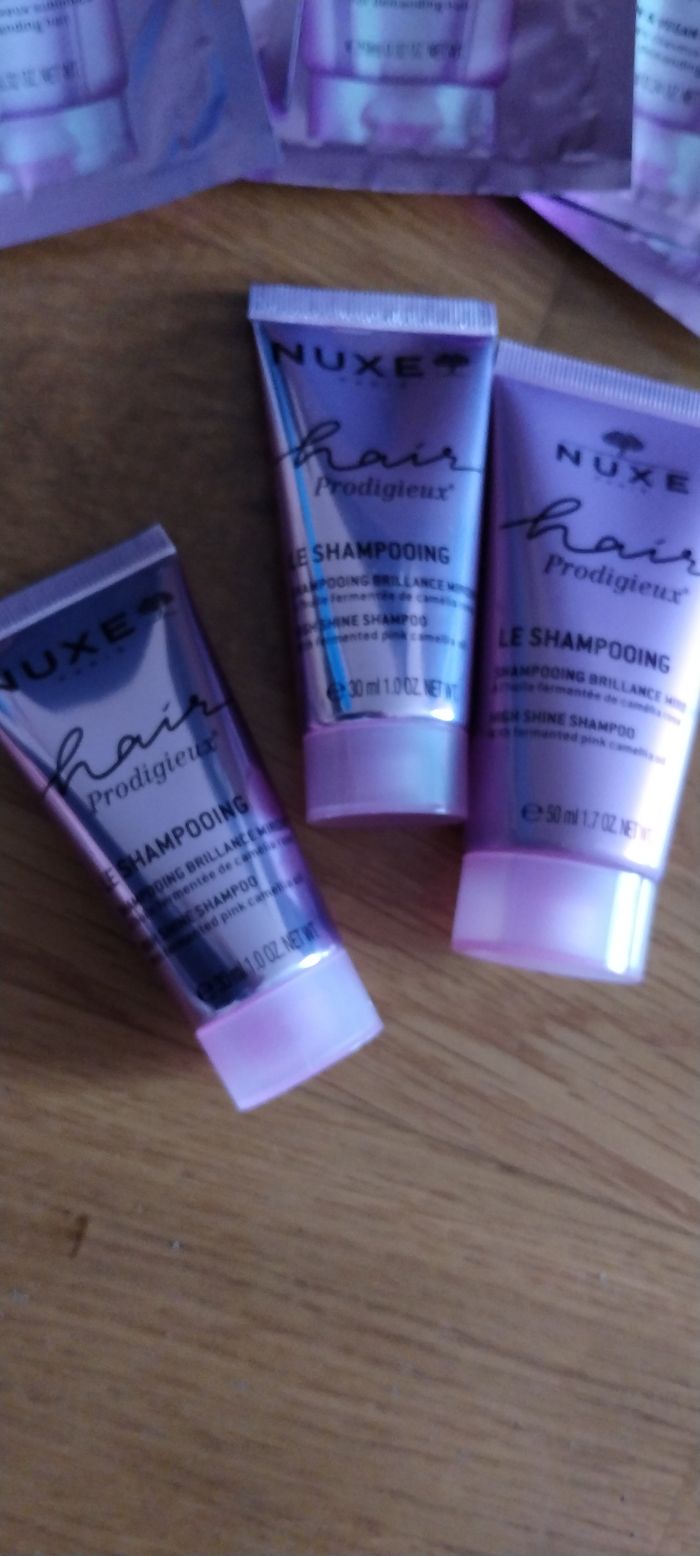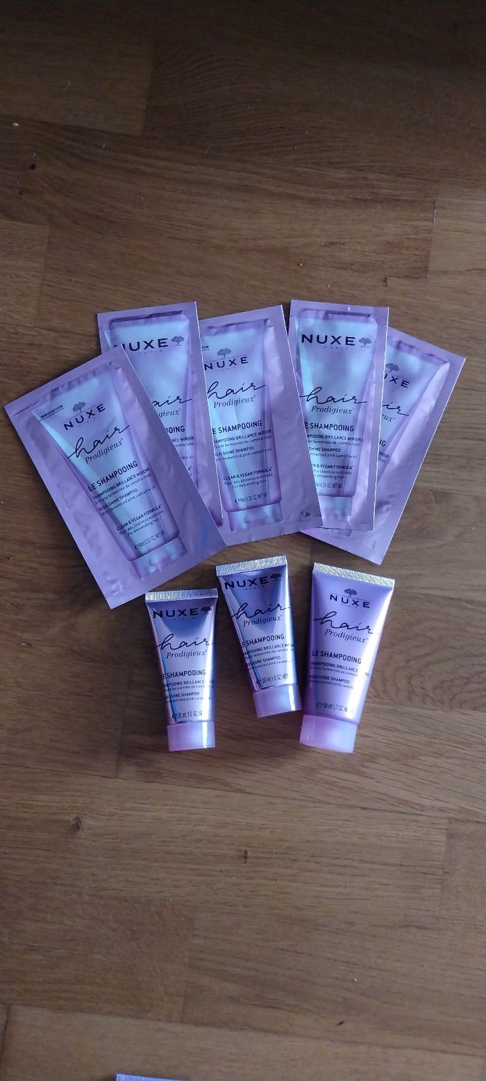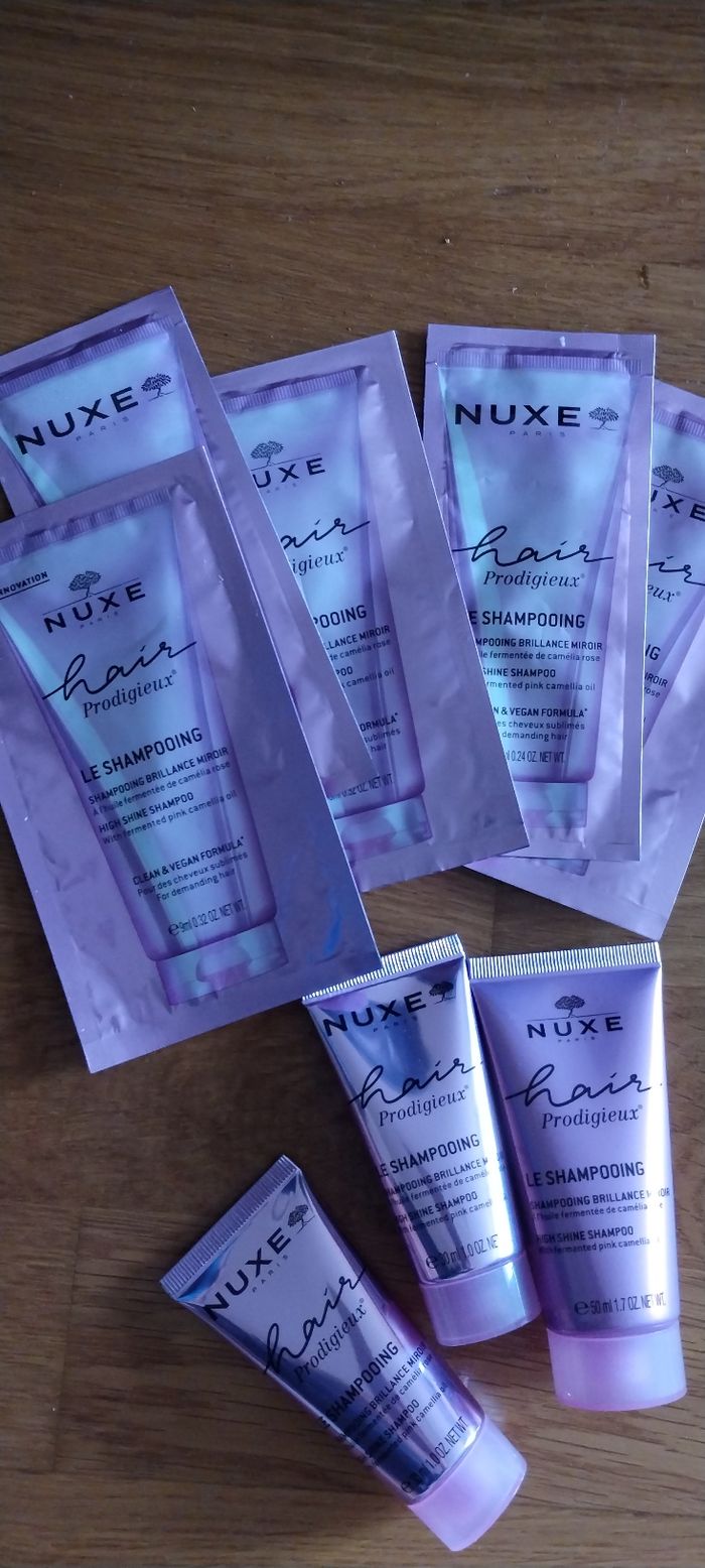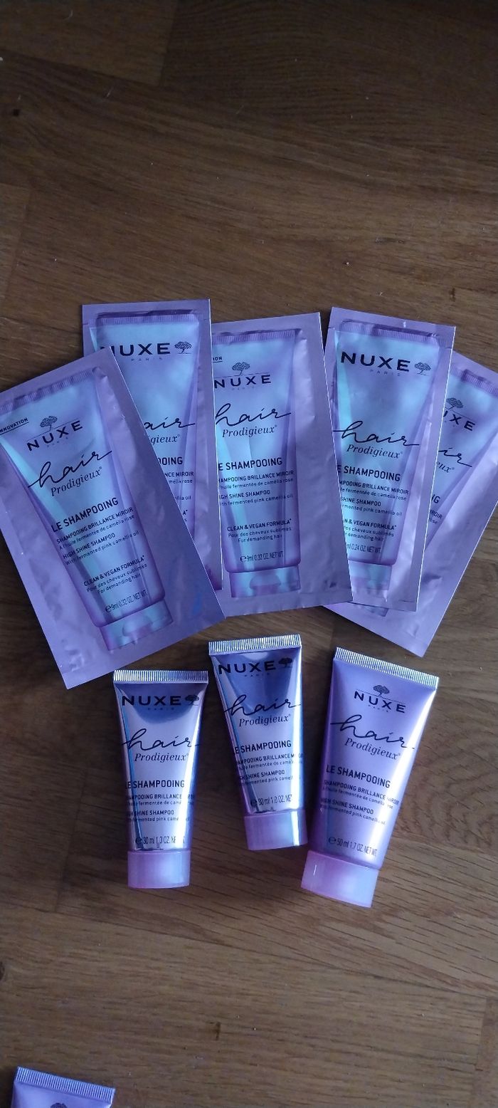 Lot shampoing Nuxe 2 tubes de 30 ml un tube de 50 ml + 5 x 7 ml en dose d'essai Hair prodigieux shampoing brillance miroir