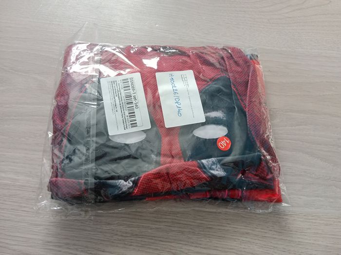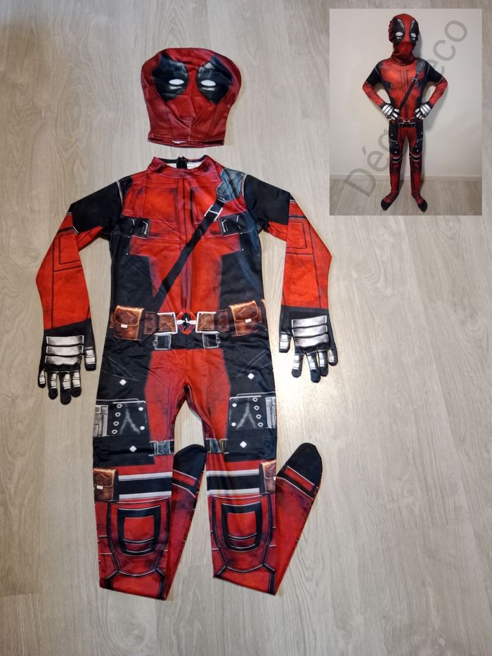 Déguisement inspiré de Deadpool. Taille 140 (10 ans) Combinaison complète avec pieds et gants intégrés + cagoule Fermeture dans le dos et braguette sur le devant. #carnaval