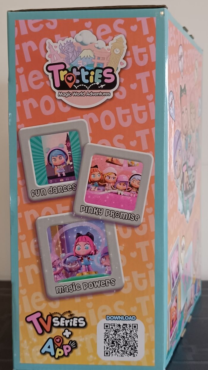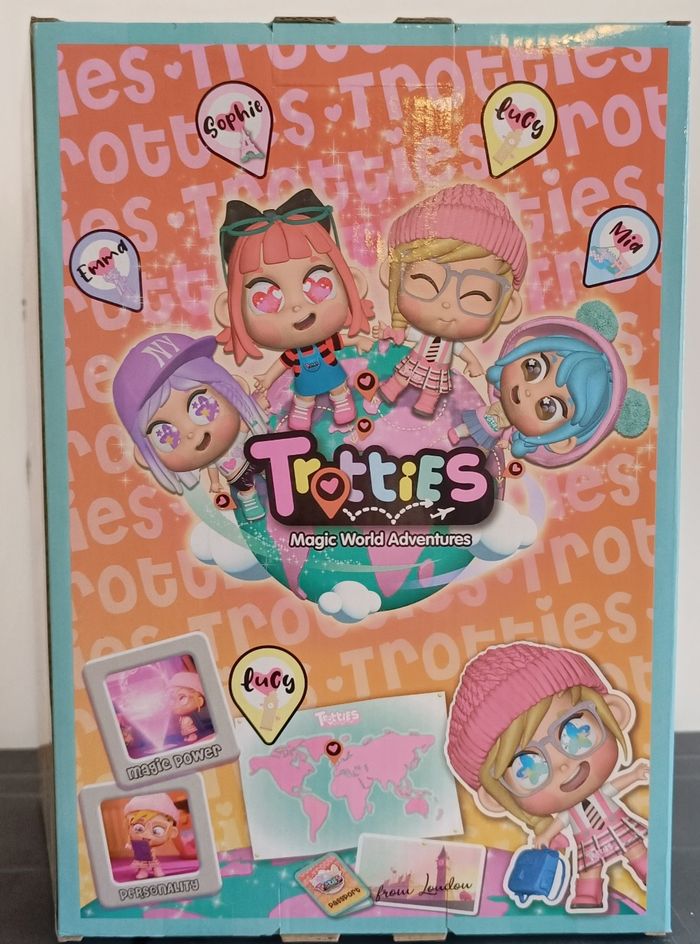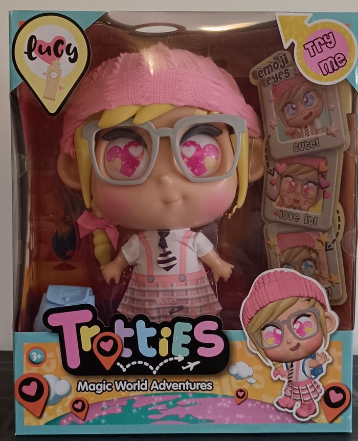 Les Trotties sont des poupées magiques stars d'un dessin animée adorée des enfants, où elles voyagent dans le monde pour résoudre des aventures folles grâce à leurs pouvoirs spéciaux. Lucy, l'héroïne originaire de Londres, est la plus bavarde et incollable : elle aide des dragons, des lucioles ou explore Big Ben. Comme dans Toy's Story elles s'animent quand les enfants s'absentent ! Découvrez la série à la TV ou sur YouTube – un hit pour stimuler l'imagination des petits. Yeux Émoji Interactifs : Appuyez sur le bouton pour changer l'humeur de Lucy – "J’adore ❤️", "J’aime 😍", "Incroyable 😲" ! Tenue Chic : Look écolier (t-shirt, jupe bretelles, cravate, bottines) + sac à main bleu adorable. Taille : 25 cm, parfaite pour les mains des enfants. Objectifs Pédagogiques : Ce jouet favorise le jeu créatif, le développement émotionnel (exprimer les sentiments via les yeux), l'imagination (aventures mondiales), la sociabilité (collectionnez Sophie, Mia, Emma) et les compétences manuelles. Âge : Dès 3 ans – Idéal cadeau ! Envoi rapide ou a retirer sur place à Montpellier Sud