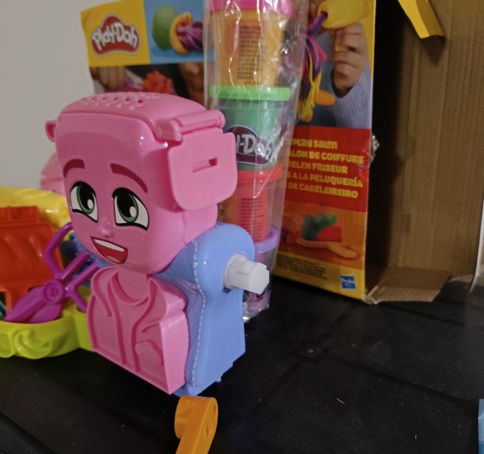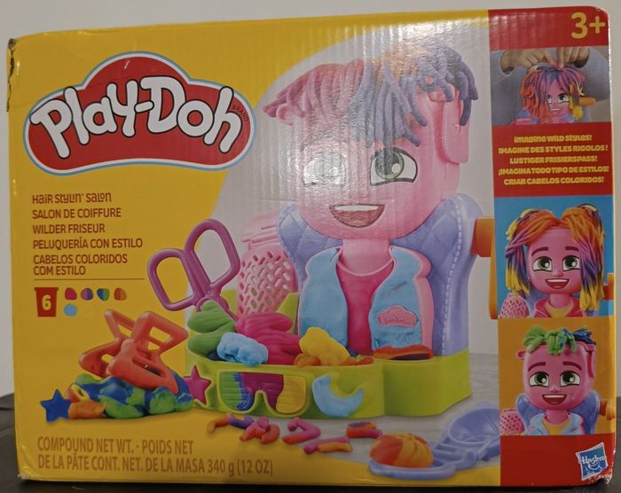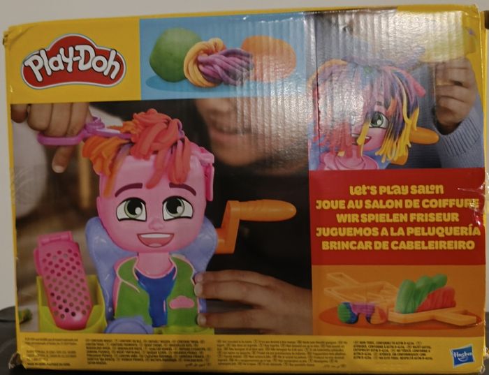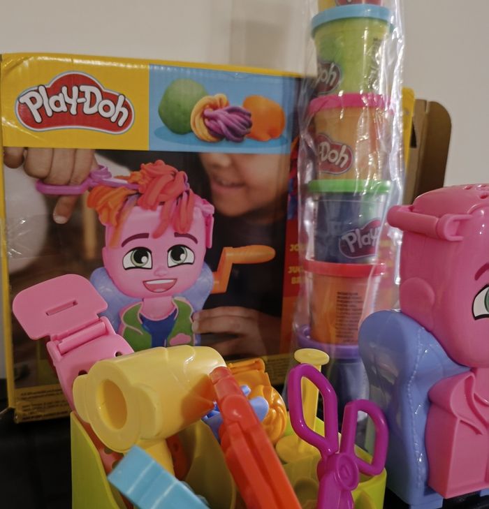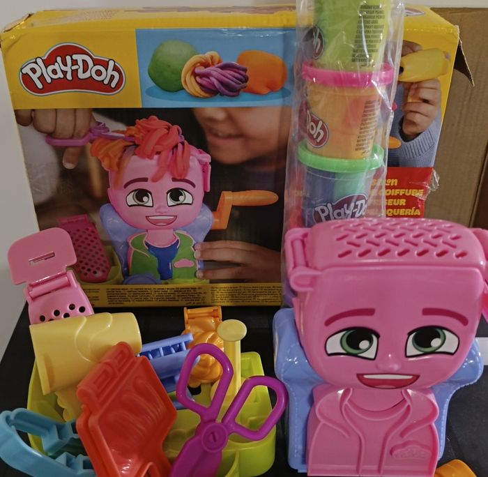 Place à la créativité ! Avec ce coffret complet Play-Doh Salon de Coiffure, les enfants imaginent, font pousser et coiffent des cheveux multicolores à l’infini. Inclus : 6 pots de pâte Play-Doh (3 bicolores) + tous les accessoires pour un vrai salon (sèche-cheveux, fer à gaufrer, ciseaux, moules, rangements). Tous les accessoires sont réutilisable avec de la pâte à sel faite maison, qui peut aussi être colorée. Vraiment pas cher pour occuper les enfants. Ludique, coloré et parfait dès 3 ans, ce jouet développe imagination et dextérité tout en promettant des heures d’amusement. 🧡 Super idée cadeau ! Produit complet et en excellent état. Neuf dans son emballage d'origine. L'emballage est un peu abimé (cf photos), ce qui n'enlève rien a l'excellente qualité du produit.
