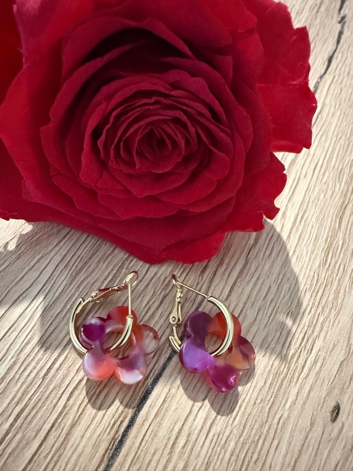 Boucles d’oreilles dorées avec fleurs  multicolores tendances (diamètre :1,6cm)