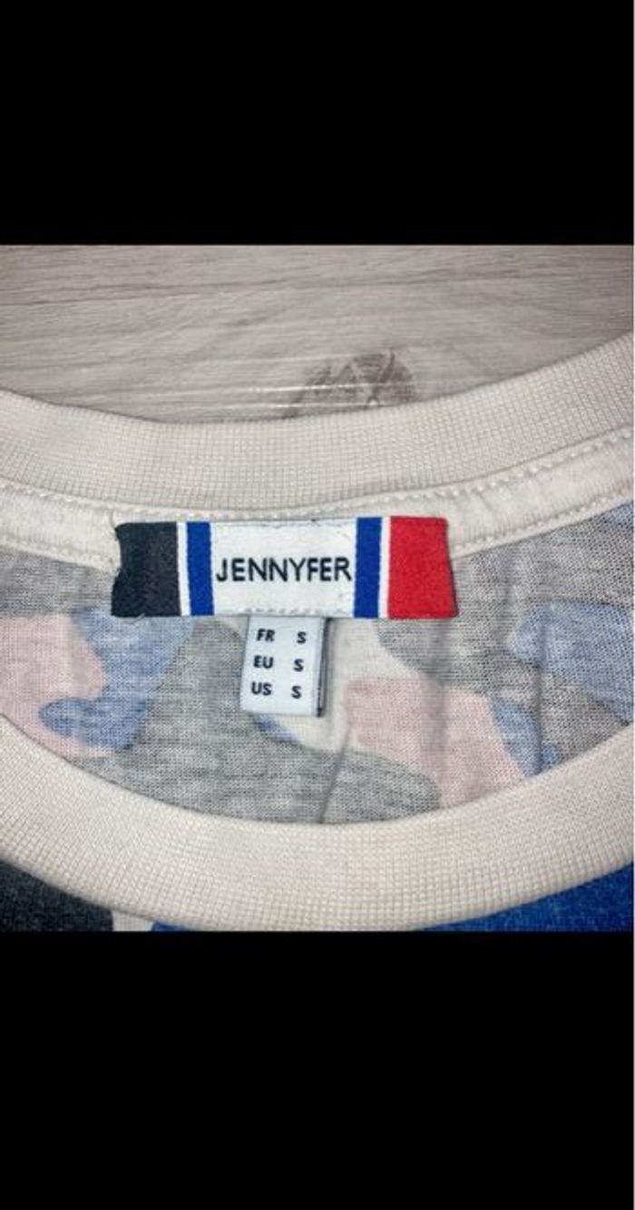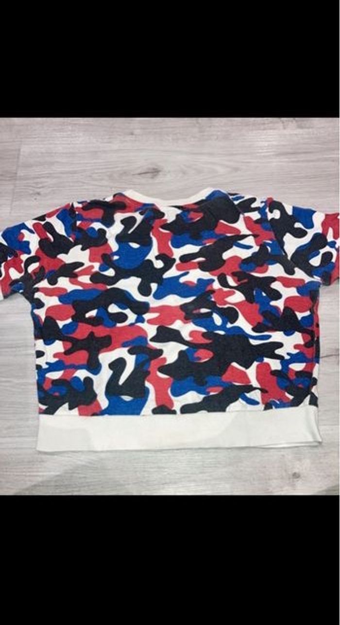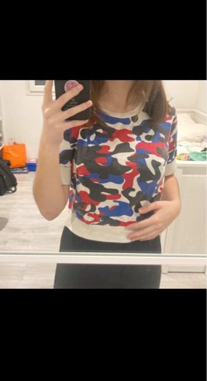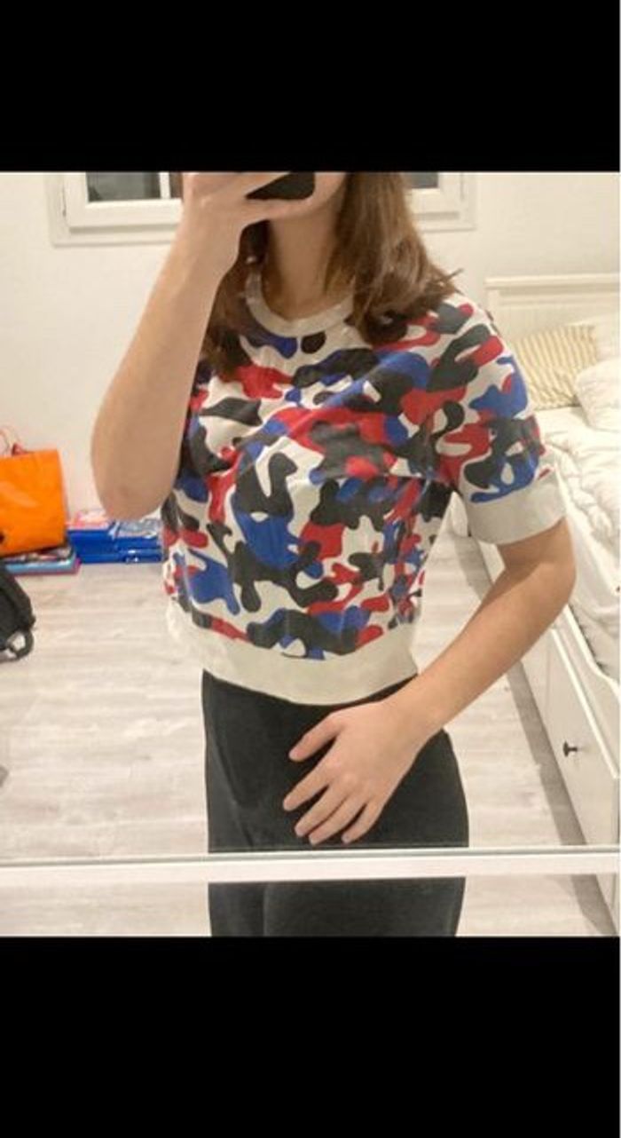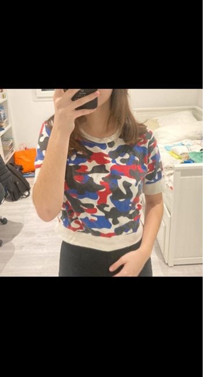 Top court, style militaire tricolore et porté plusieurs fois. Taille S. Passage en machine visible.