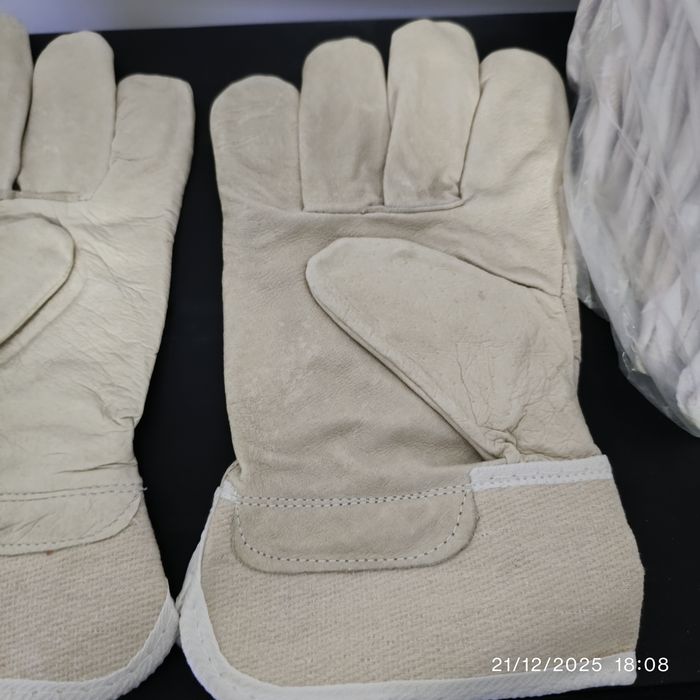 Cuir de porc aux couleurs vives Perceuse de couleur blanche. Paume entière de la main - Partie adhérente du gant en une seule pièce de cuir, grâce à laquelle ils montrent une meilleure durabilité et résistance à l'usure. Doublure intérieure en tissu pour plus de confort. La peau de porc douce assure une meilleure sensation de l'objet par l'utilisateur, sans perdre la force du gant.