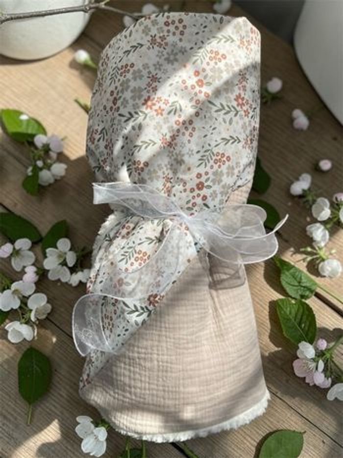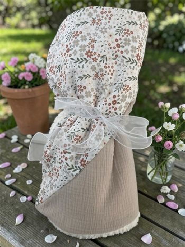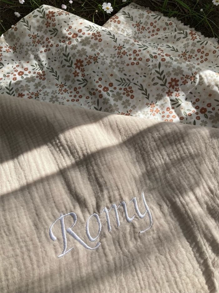 Une couverture unique pour bébé, entièrement conçue en tissus certifiés Oeko-Tex, sans substances nocives. • Dimensions : 90 x 90 cm • Face douce : Sherpa moumoute ultra-douce et chaude • Face originale : moitié tissu fleuri / moitié double gaze de coton uni • Personnalisation : choix de la couleur de la gaze de coton et broderie du prénom au choix • Large choix de couleurs : • Gaze de coton uni : 21 couleurs • Broderie : plus de 80 couleurs Une couverture à la fois douce, originale et personnalisable, idéale pour câliner bébé ou comme cadeau unique et personnalisé.
