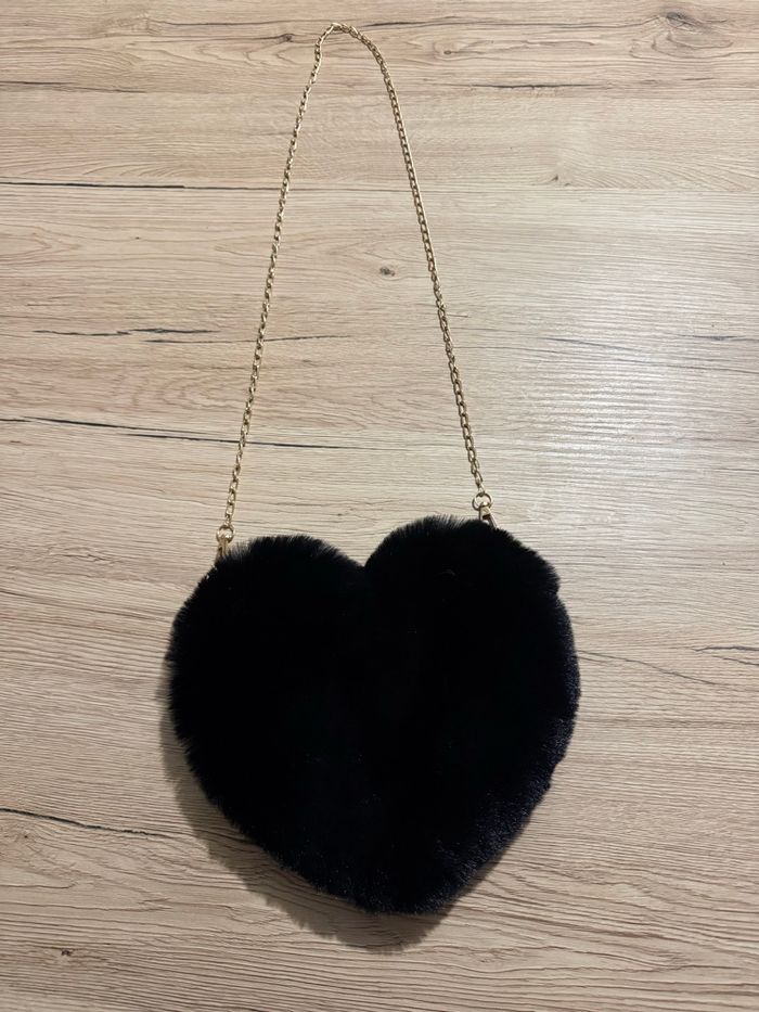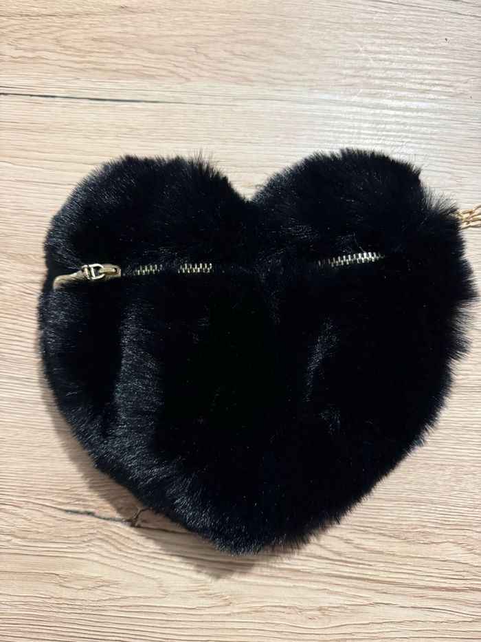 Petit sac à main noir en cœur effet moumoute tout doux avec sa chaînette dorée. 20cm de hauteur sur 24cm de largeur
