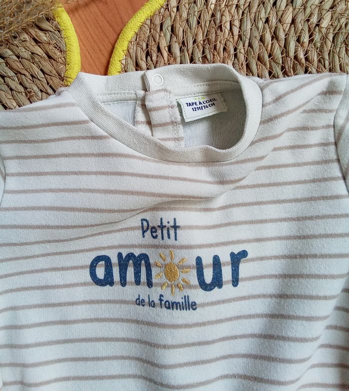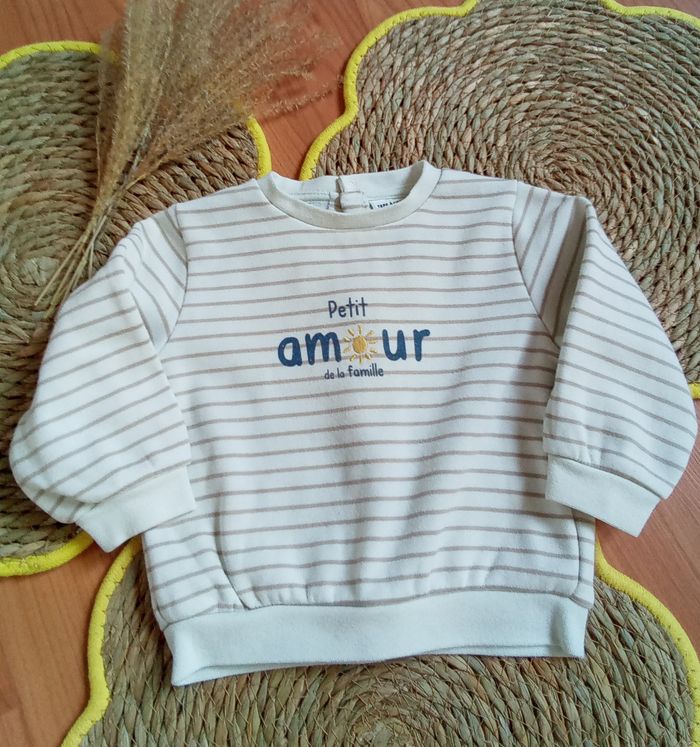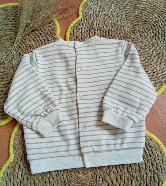 🐭 Sweat crème avec rayures marron et inscription 🐭 Boutons pressions dans le dos 🐭 Étiquette coupée pour la composition 🐭 Bien porté mais reste en bon état 🐭 Taille 12 mois