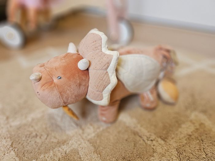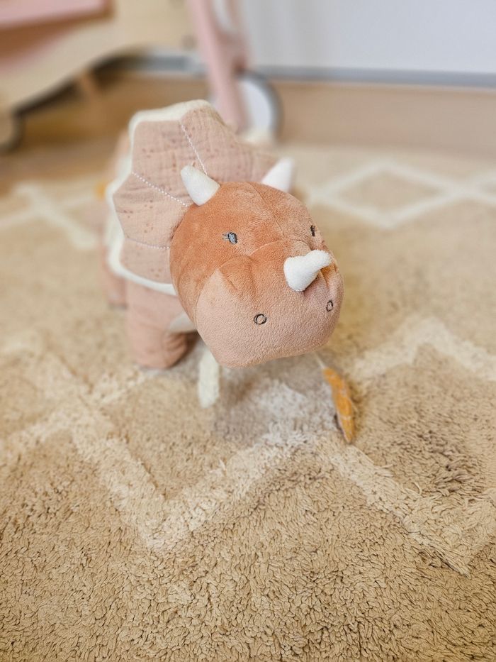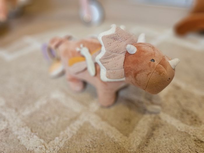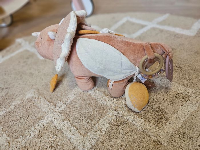 Popsie la gentille dinosaure offre de nombreuses activités : hochet aux billes multicolores, des jouets de dentition pour soulager les poussées dentaires, feuilles en papier froissé, un pouêt. Votre enfant explorera ce jouet et stimulera sa motricité, son développement intellectuel et ses sens à travers ces différentes activités : toucher, ouïe et vue seront alors stimulés. Petit plus: l'anneau TPE facilite la préhension du jouet par bébé. Couleur : - rose En excellent état