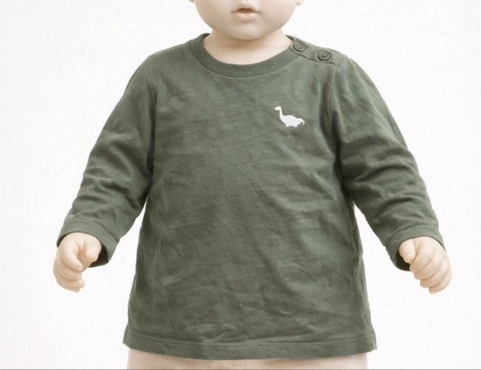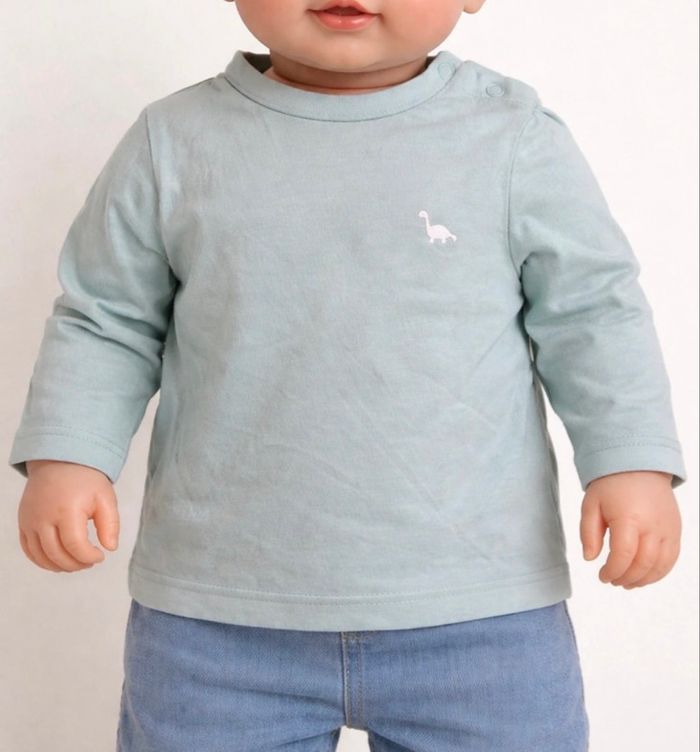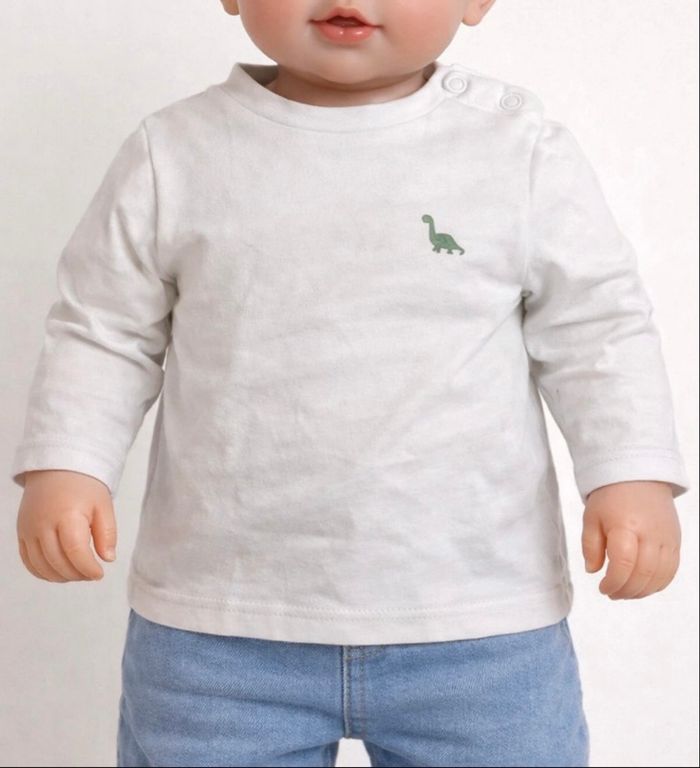 Lot de 3 t-shirts / hauts bébé avec petit motif dinosaure, mignons et faciles à assortir. Détails : • 👕 3 hauts manches longues • 🎨 Couleurs : blanc, vert clair, vert foncé • 🦖 Motif dinosaure discret sur la poitrine • 👶 Boutons pression à l’épaule pour un habillage facile • 🌱 Tissu doux et confortable • 📏 Taille : 12 mois (74cm) État : Bon état général, quelques plis visibles dus au rangement, le blanc à une légère tache au niveau du col. Idéal pour le quotidien.