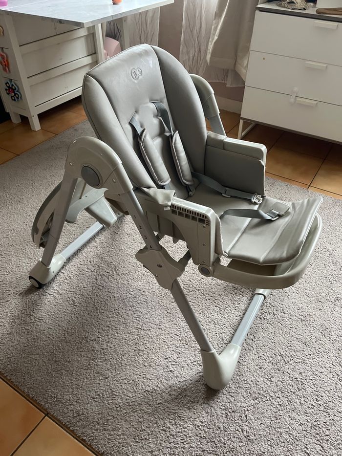 Chaise haute en bonne état. Les roues ont étés grignotées par le lapin mais n’empêche en rien le fonctionnement. Réglables différentes hauteurs marche pieds réglable également