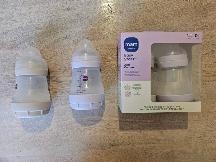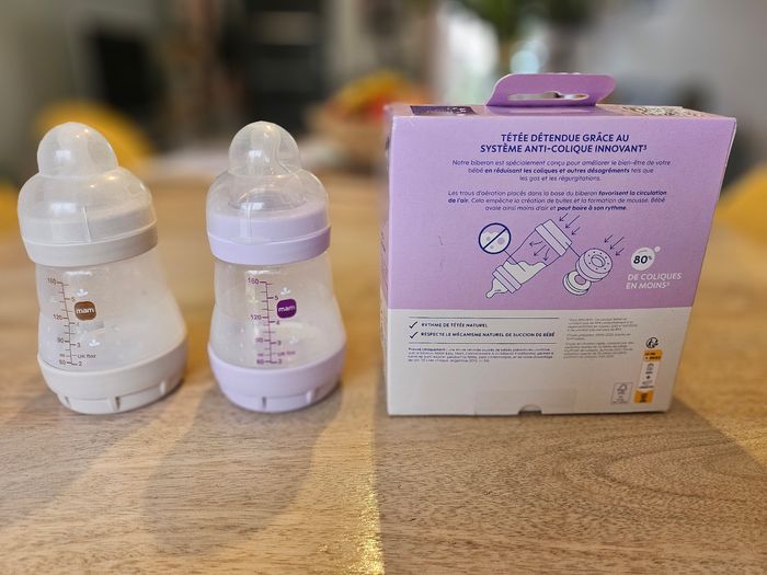 Lot de 4 : 3 biberons neufs et 1 utilisé. Par mesure d'hygiène, les deux biberons qui ne sont pas dans la boîte n'ont pas de tétine. MAM Biberons Easy Start/Anti-Colique - 160ml - Lilas + Sable - Tétines Débit lent