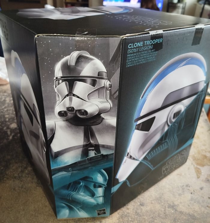 Casque électronique neuf Star wars the black series Soldat clone 501e légion Fonctionne avec 3 piles AAA non fournies Tailles emballage : 30,5cm*30,5cm*30,5cm Poids : 1678 gr Hasbro