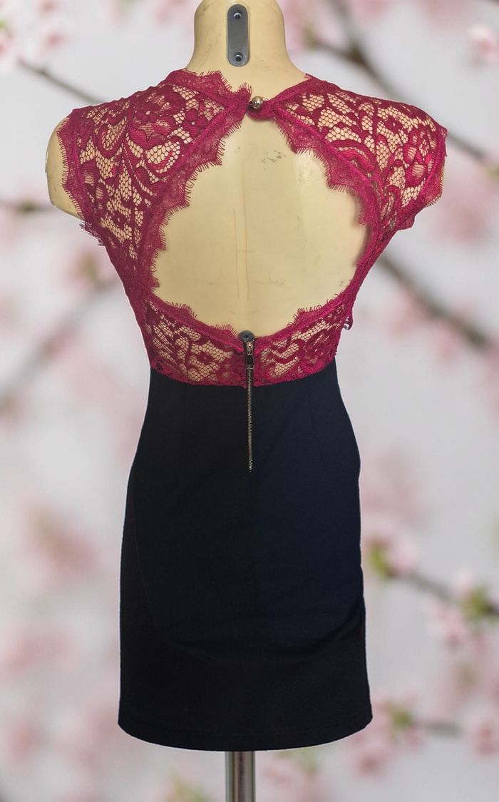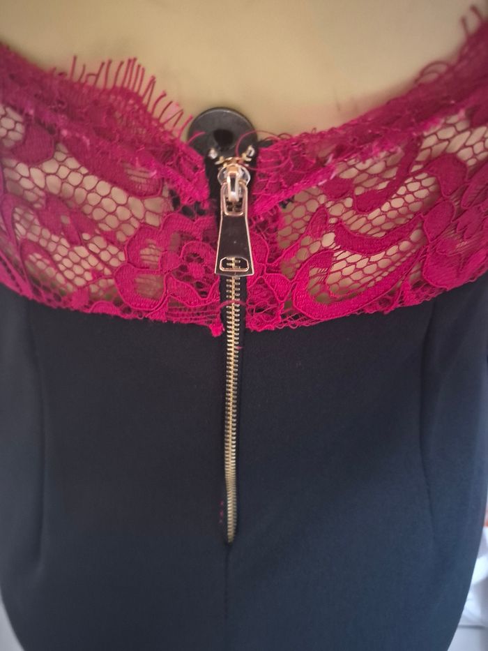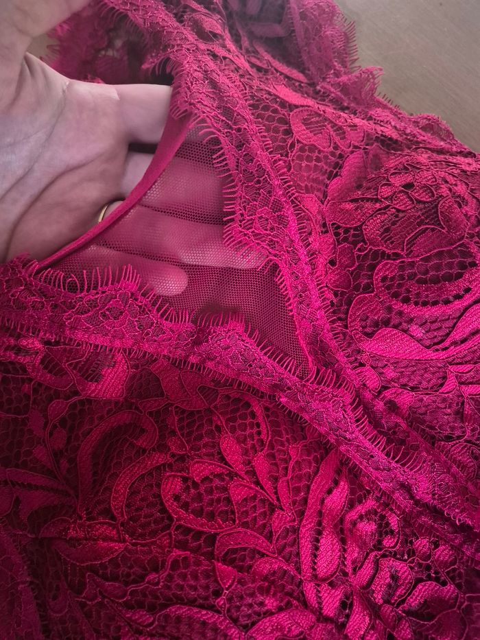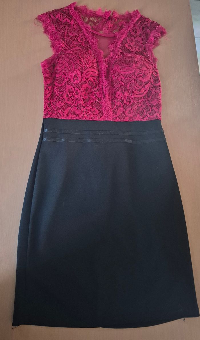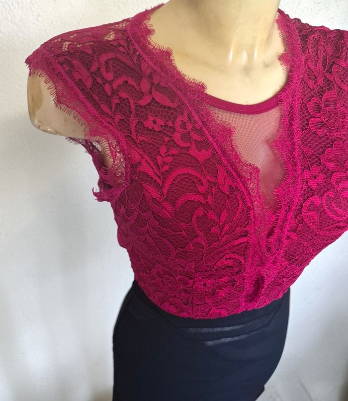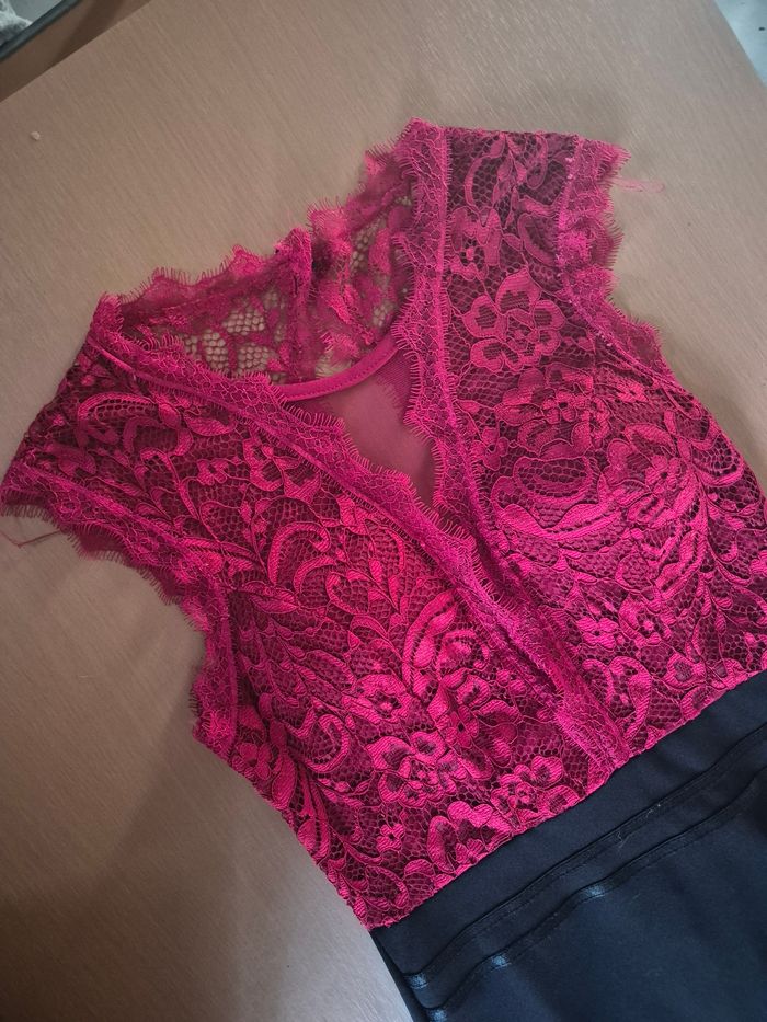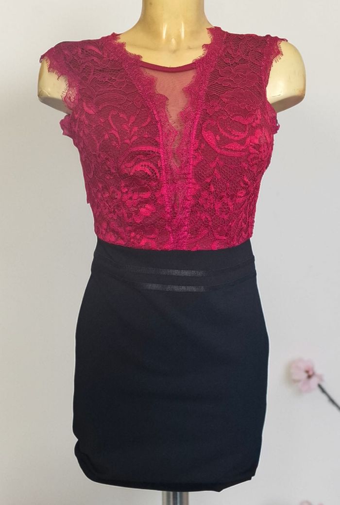 sublime robe rouge et noir tout en dentelle ouverture dans le dos également des coques dans la poitrine et une ouverture transparente sur la poitrine très élégante se porte très près du corps aller dans un état nickel