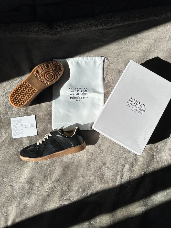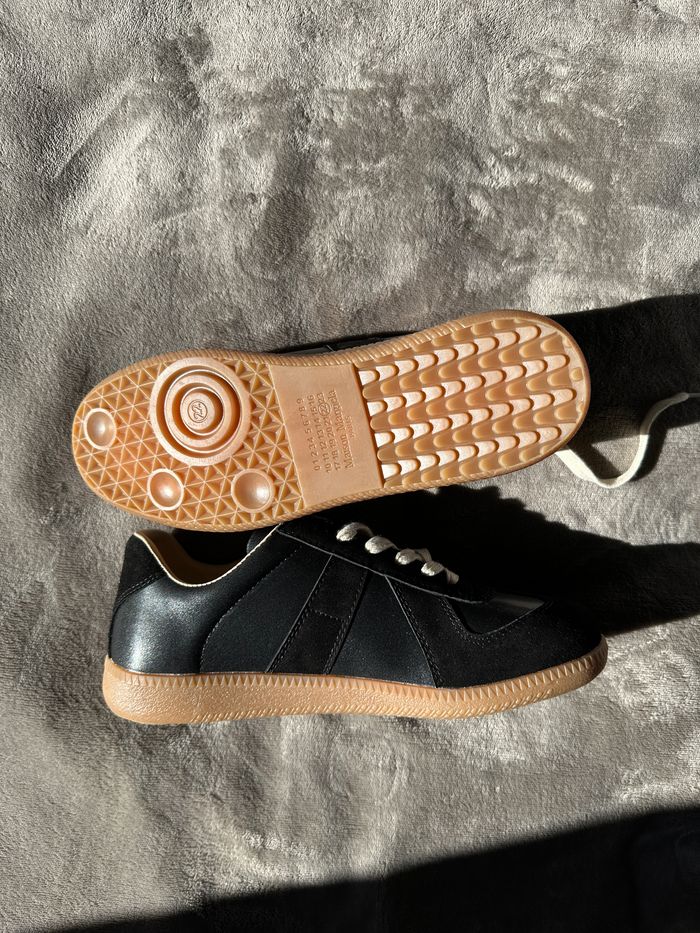 e mets en vente ces sneakers Maison Margiela Replica German Army Trainer, coloris noir avec semelle gomme, modèle iconique de la maison. Portées uniquement 2 fois en extérieur, l’état est quasi neuf : aucune trace majeure, semelles très peu marquées, intérieur propre. Cuir lisse et daim noir de belle qualité, doublure cuir beige très confortable, lacets écrus d’origine. Vendues avec la boîte, le dust bag et la carte d’authenticité visibles sur les photos.