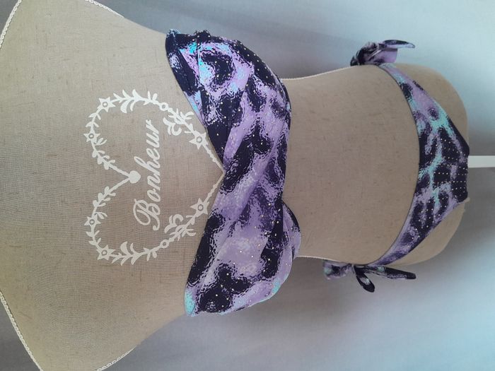 Maillot de bain, avec strass sur le devant, haut sans bretelle à coque, croisé devant Sous poitrine : 32cm Matière : 82 % Nylon, 8 % Elasthanne Marque : Rouzing