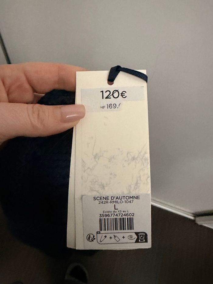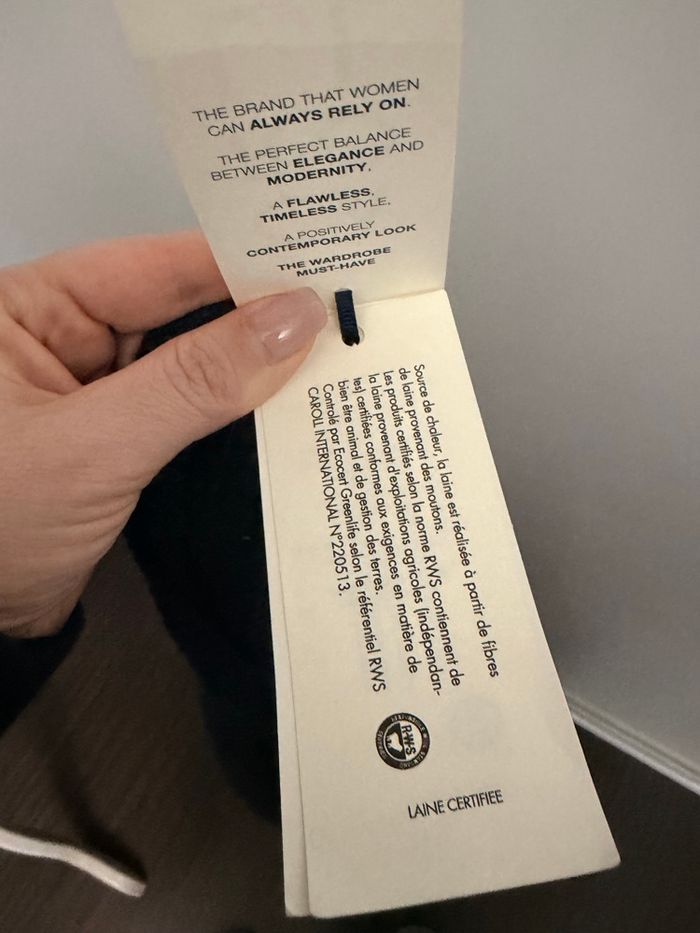 Je vends cette robe-pull en maille de la marque Caroll, neuve avec étiquette. > * Pourquoi je m'en sépare : Je fais un grand tri dans mon dressing et je ne l'ai finalement jamais portée. > * État : Neuve avec étiquette. Elle est impeccable, aucun défaut à signaler. C'est une pièce de grande qualité en laine certifiée (norme RWS pour le bien-être animal). > * Coupe/Taille : Taille L. La coupe est droite et moderne avec un joli travail de maille en relief sur le devant et le dos (modèle "Scène d'Automne").