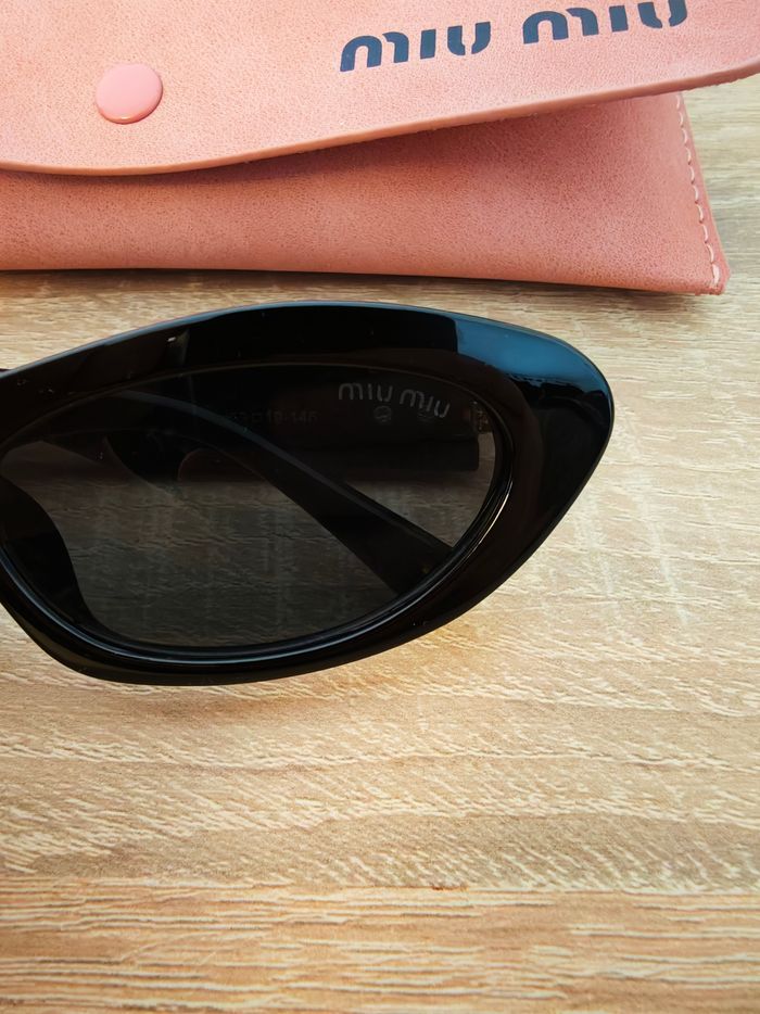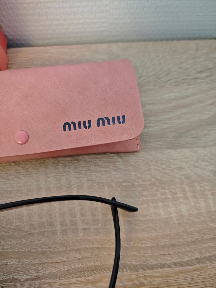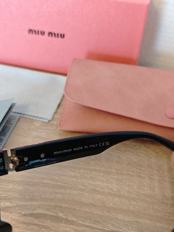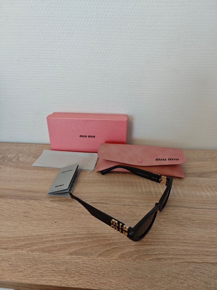 Lunettes de soleil miu miu noire et logo doré avec boîte de lunettes ainsi que nettoyant à lunettes, tous marqué par le nom miu miu. Pour plus de renseignements, n'hésitez pas à me contacter. Expédition rapide et soignée sous 24h📦