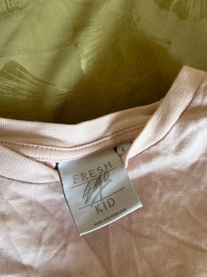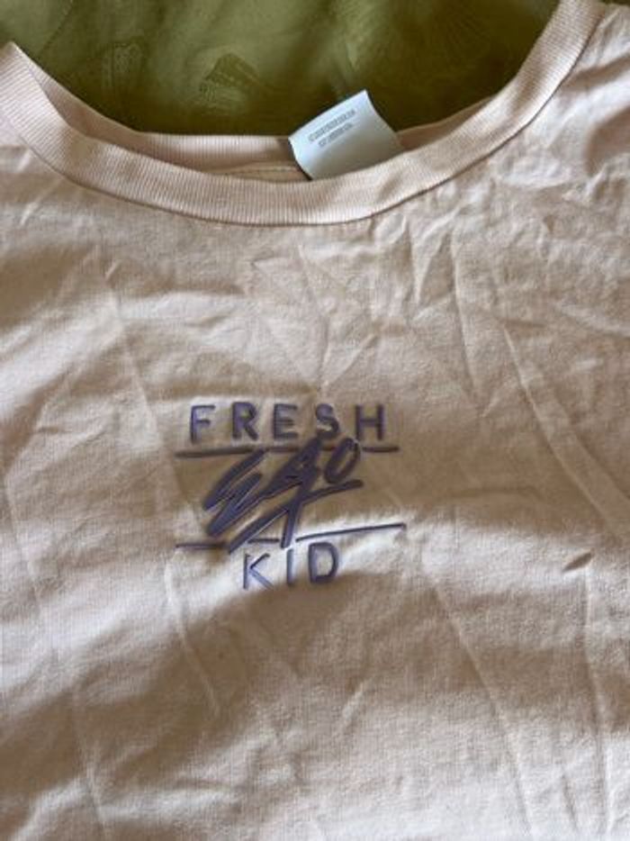 T-shirt Fresh Ego Kid – Taille L T-shirt rose pâle avec logo violet “Fresh Ego Kid” en relief à l’avant. Coupe légèrement oversize, confortable et facile à porter. Taille L (peut convenir pour un look loose)