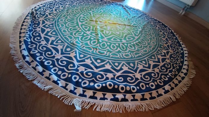 Merci de bien l Drap serviette tapis ... Rond, diamètre en photo. Coloris blanc bleu jaune vert Couleurs vives de l'été Bordures avec petites franges Il a servi kk fois. Défauts : lavé mais peut avoir kk restes dherbes sèches coincés dans la fibre. Sinon bon état Réductions activées 🎁 Livraison mondial Relay 🚛