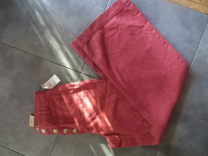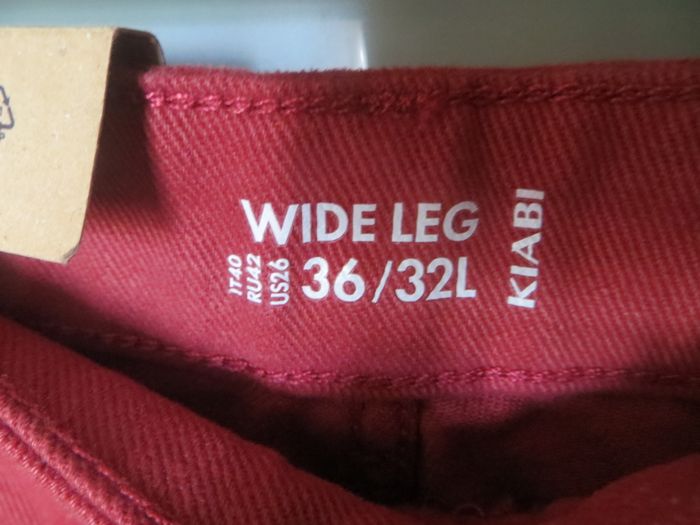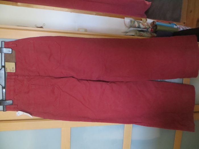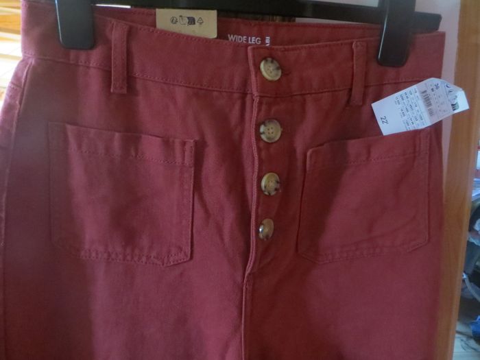 Pantalon wide kiabi 36 Jambes larges, taille haute Jolis boutons et poches plaquées devant pour un petit look 70's Très joli coloris rouge bordeaux, très tendance 100% coton, matière très douce ceinture à passants 2 poches à l'arrière Taille à plat : 36 cm Longueur ~113 cm Largeur bas de jambe : 31 cm Neuf étiqueté