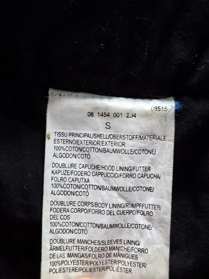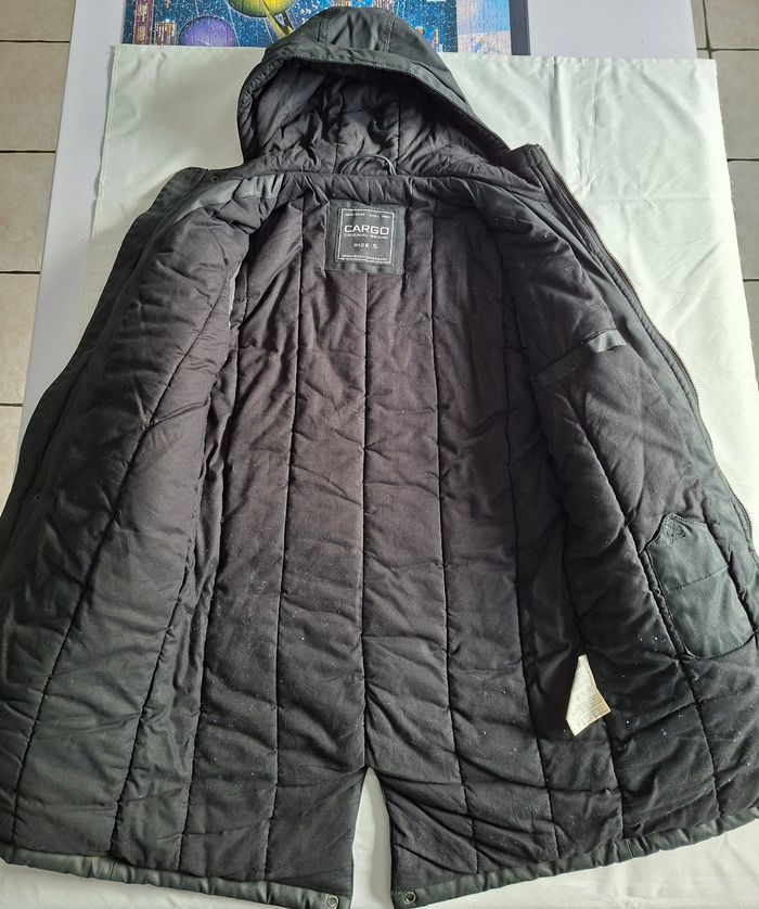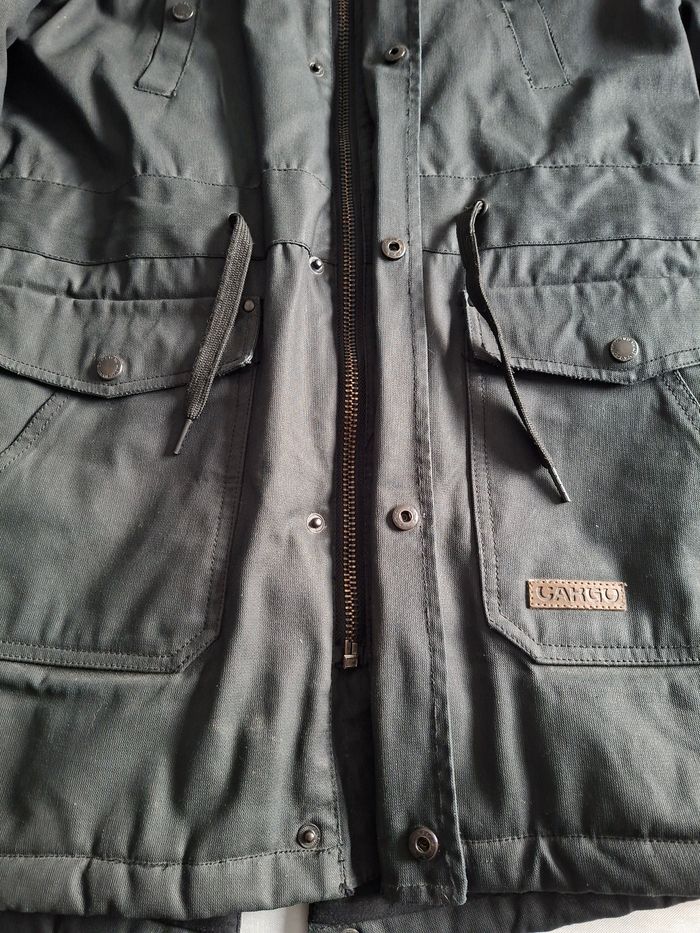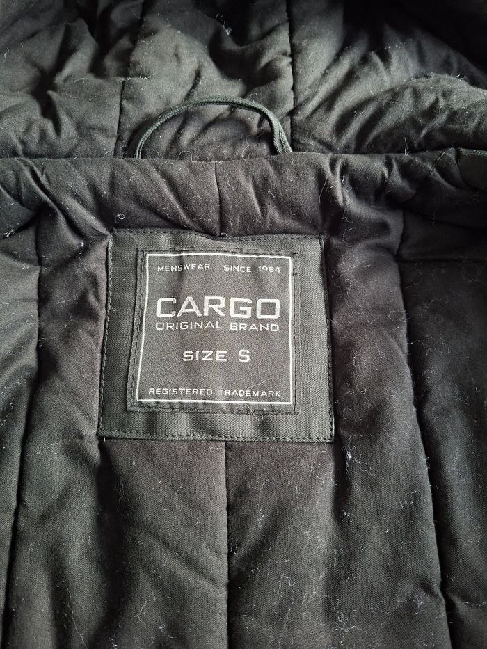 Parka homme avec capuche Marque Cargo Couleur noire Taille S 2 poches latérales avec boutons pressions 2 poches mi-hauteur avec boutons pressions Cordon de serrage pour la capuche Cordon de serrage au niveau de la taille Fermeture éclair + boutons pressions Intérieur 100% coton Extérieur 100% polyester Bon état N'hésitez pas pour plus d'informations