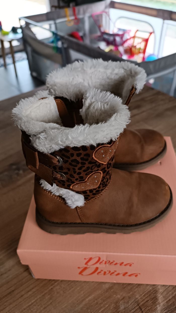 Bottes fourrées marron en daim imperméabiliser, pointure 26, de marque Divina, porté 1 fois. Possibilité de faire des lots