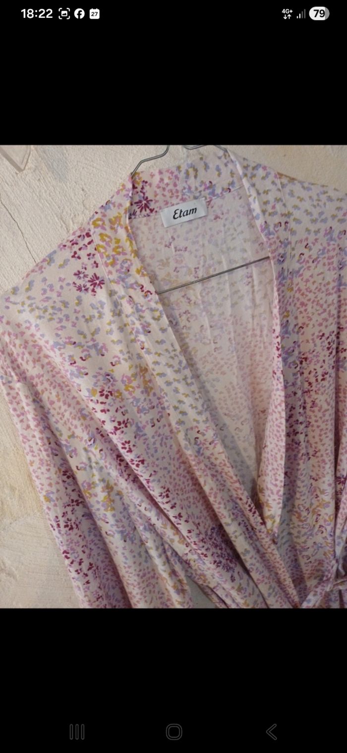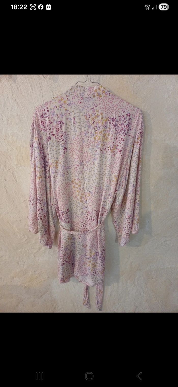 Kimono fleuri croisé à l intérieur et fermé avec une ceinture. Longueur : 87 cm environ