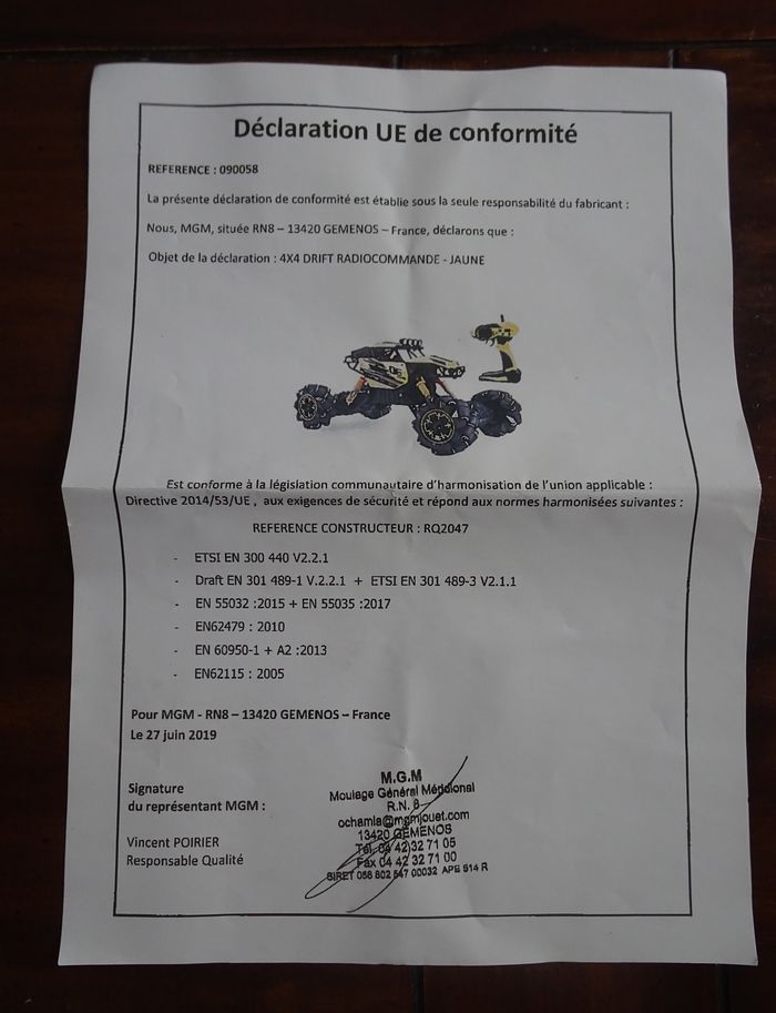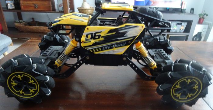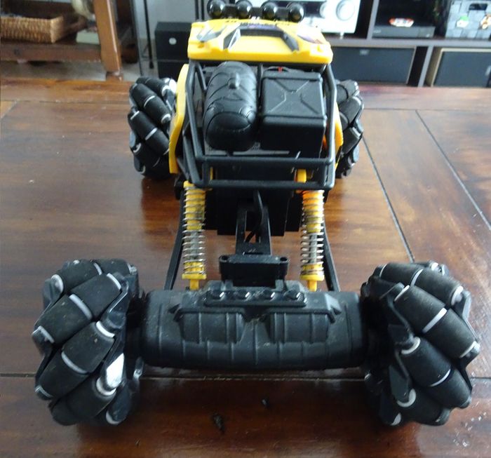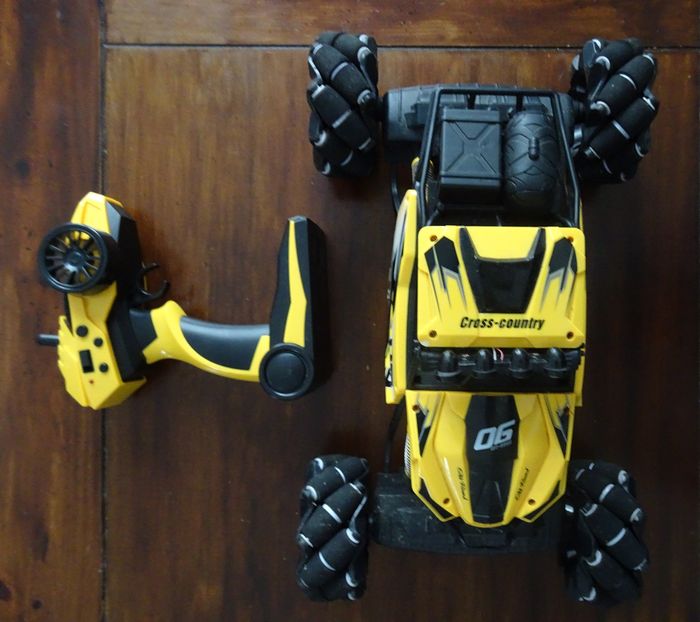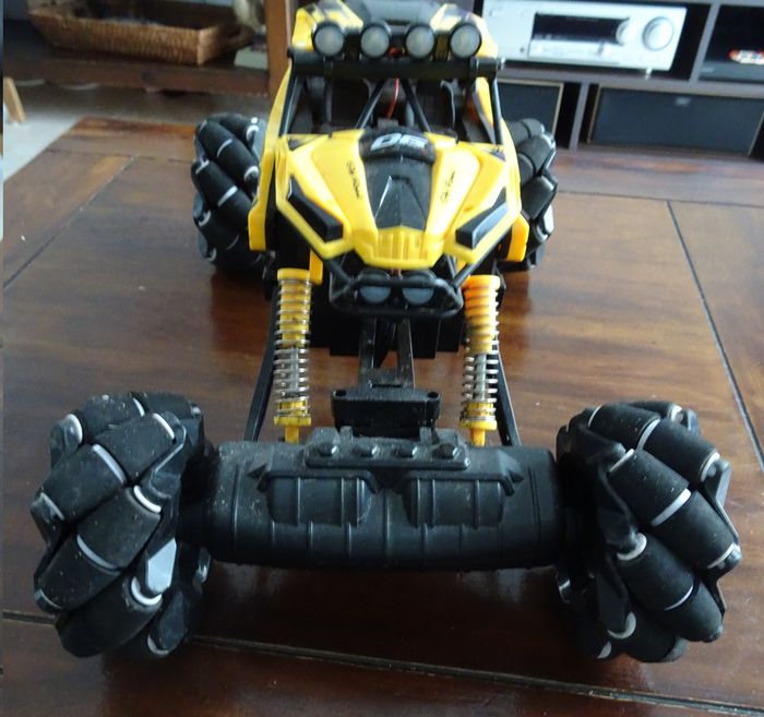 Avis aux amateurs de voiture radiocommandée tout-terrain! Ce 4x4 twist 360° à l'échelle 1/10ème offre des heures de jeux. Son look surélevé et sa couleur jaune sont idéals pour avoir la sensation de commander un vrai bolide de rallye. La portée de la télécommande est de 50 m. Rapide et réactif, la voiture peut rouler à l’intérieur et à l’extérieur à une vitesse allant jusqu’à 15 km/h. Fonctionne avec sa batterie de 7,4 v fournie et 3 piles AA pour la télécommande (non fournies). Cable de recharge de batterie fourni. Voiture musicale et lumineuse, elle peux effectuer une «danse». Conçu en polypropylène résistant, ce 4x4 turbo drift télécommandé mesure 35 x 18 x 23 cm environ. En bon état de fonctionnement.