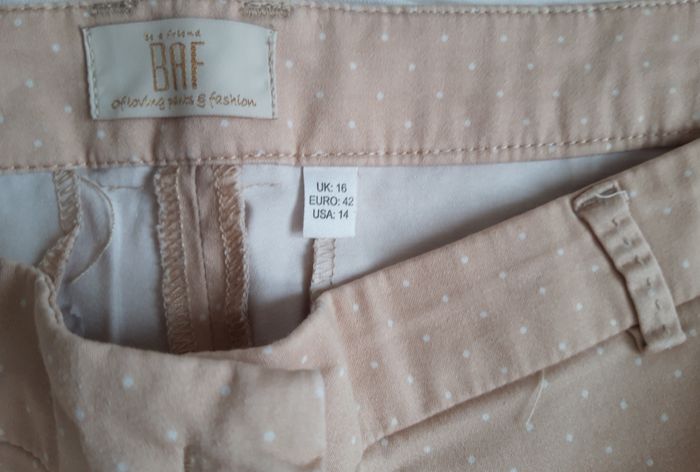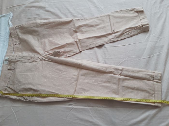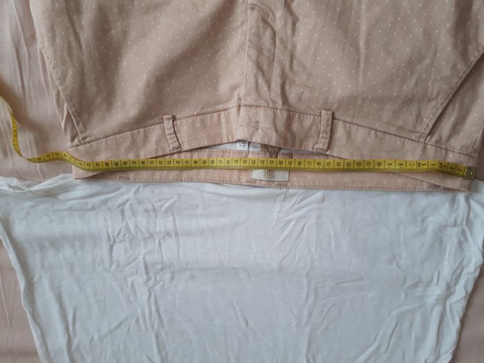 Pantalon style chino marque "BAF" (marque anglaise) taille EUR 42 couleur beige clair et blanc longueur 7/8ème (83cm de la ceinture jusqu'en bas) TRES BON ETAT GENERAL, à repasser PRIX: 5 EUROS Remise en main propre possible contre paiement en espèce NB: si l'annonce est en ligne c'est que le produit est disponible
