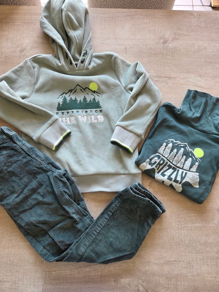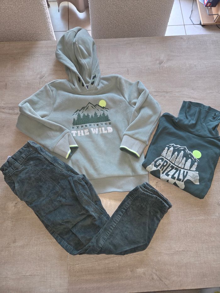 Pantalon en velours côtelé vert sapin , tee shirt un peu col roulée, et pull velours côtelé vert d'eau trop jolie , 6ans