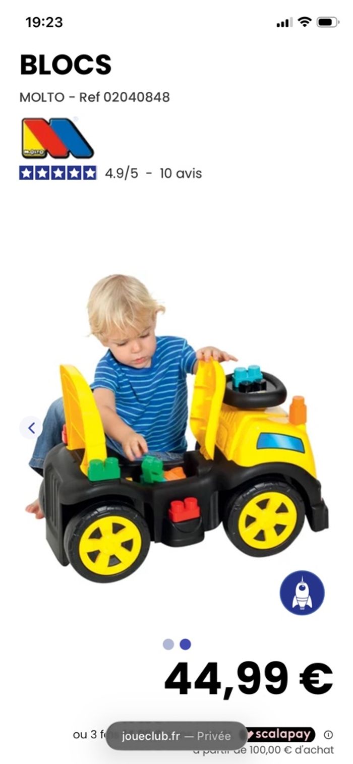 Porteur molto camion très peu servi avec blocs Acheté chez joue club Albi photo avec prix achat 6/12 mais peut faire jusqu’à 20kgs pour l enfant