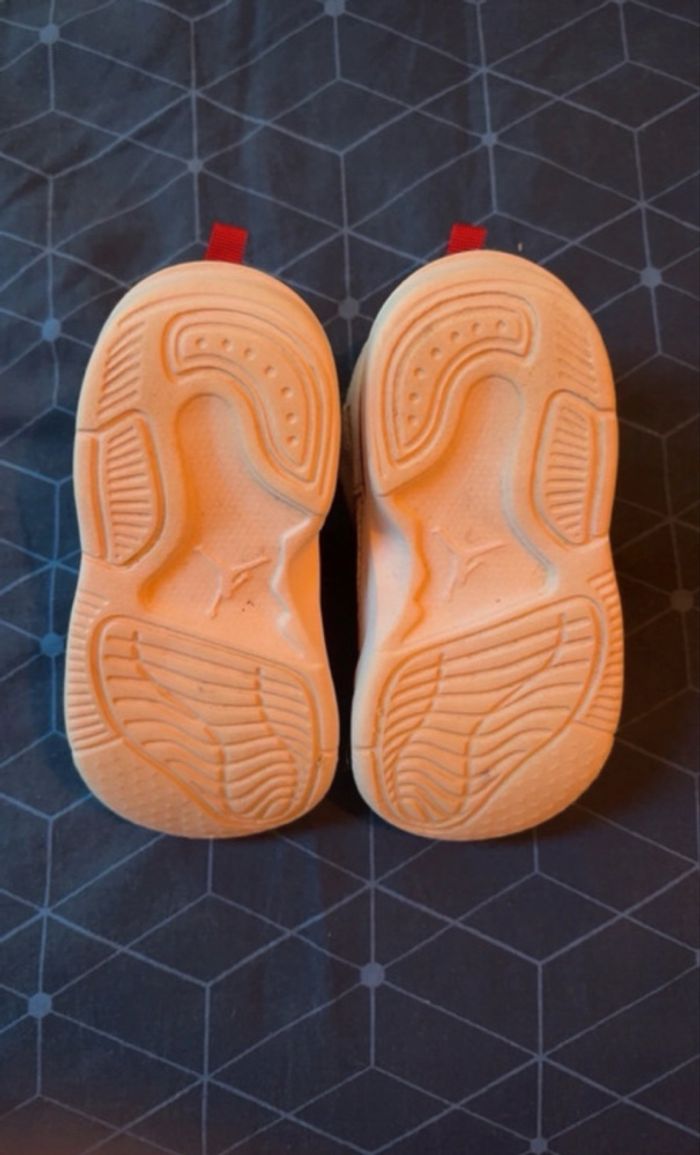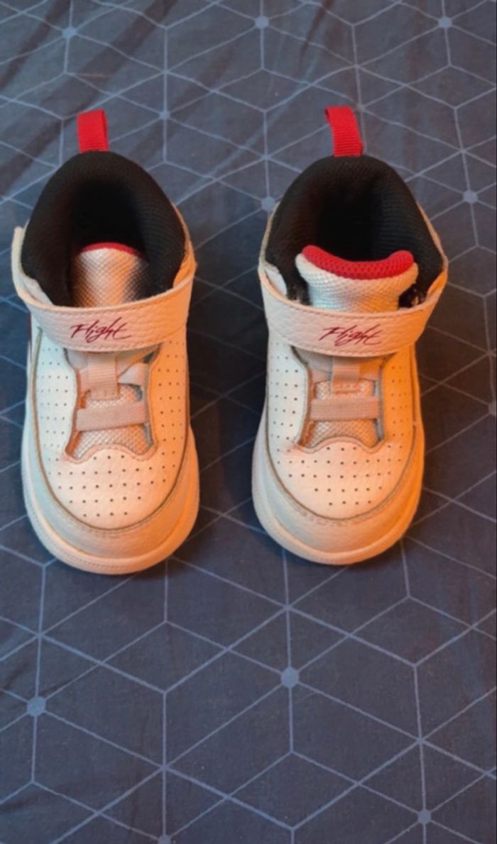 Jordan bébé, parfaites pour les premiers pas it Modèle blanc avec détails rouges, fermeture scratch très pratique. •Taille : 23,5 (US 7C) • Age indicatif : environ 12-18 mois * Etat : bon état général Traces normales d'utilisation sur les semelles (voir photos), intérieur propre, scratch fonctionnel. V Confortables V Faciles à enfiler V Look sport et stylé