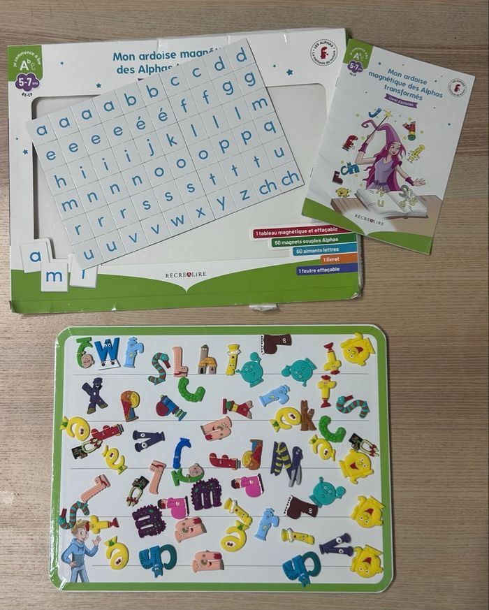 Ce kit est composé d’une ardoise magnétique, de 60 magnets des Alphas sous un format souple, de 60 aimants représentant les lettres de l’alphabet, d’un livret. Cette ardoise permet de passer des Alphas aux lettres afin de lire ses premiers textes. Manque le feutre effaçable. Emballage un peu abîmé
