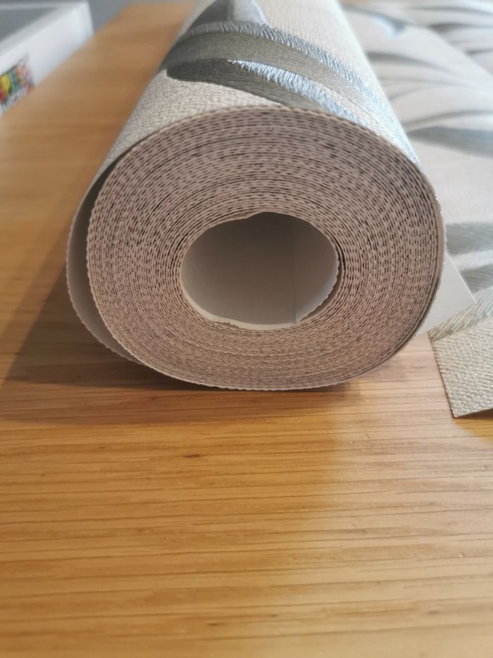 Une seul bande de prise sur le papier peint La colle reste la moitié du paquet (pour 2 rouleaux) Beige, feuille grise Valeur rouleur neuf 27.90 euros