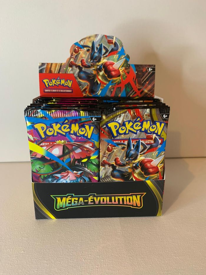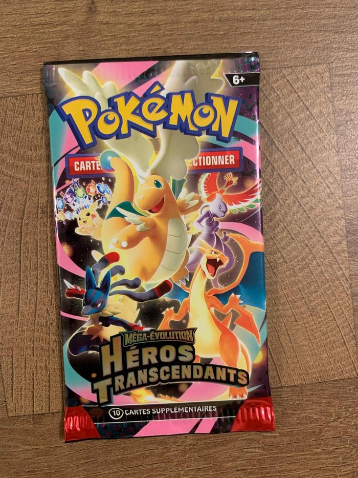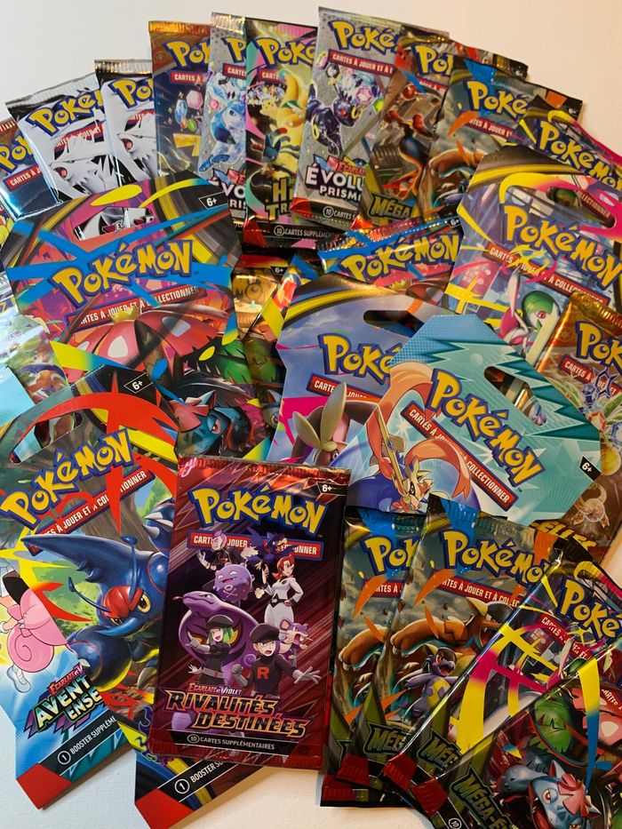 Les boosters sont parfaitement rescellés ! C’est un cadeau idéal pour des enfants ou pour compléter sa collection en ayant le plaisir d’ouvrir des boosters Le contenu est identique à un booster classique, il y a : 4 communes, 3 peu communes, 2 reverses, 1 holographique, une énergie, et une carte à code pour obtenir un booster en ligne Parmi tous ces boosters, j’ai glissé plusieurs cartes rares et/ou secrètes : Ex, AR, et Full Art Les cartes correspondent à la série du paquet, elles sont neuves, et authentiques. Prix à l’unité : 3€ Lot de 2 : 5.5€ Lot de 3 ou + : 2€ unité Sur la série 2.5 Héros Transcendants, il y a la possibilité de mettre les boosters en Mini Tin (petite boîte métallique) pour 1.5€ en plus Un coffret Tripack 30 ans est également disponible, avec une carte secrète garantie : Prix 10€ (voir dernière photo). N’hésitez pas à demander des photos au besoin et à me préciser ce que vous souhaitez comme série ainsi que le nombre souhaité