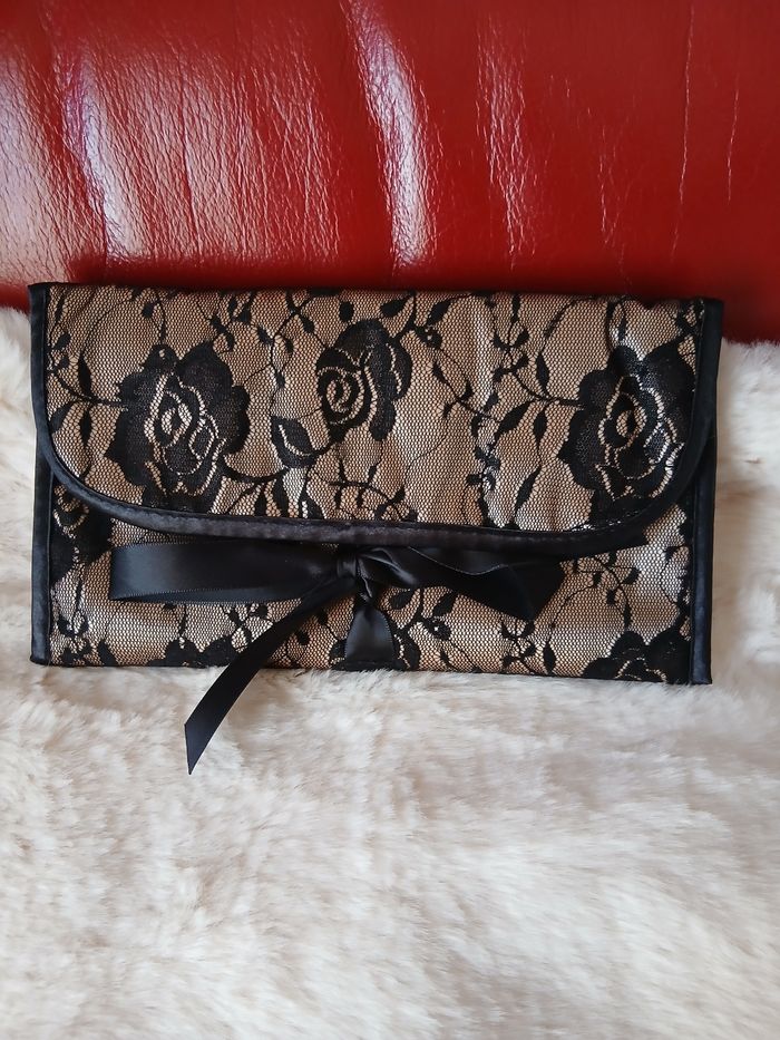 Article Neuf. Trousse maquillage de voyage; dépliable; fermeture par ruban noir. Tissu imprimé fausse dentelle dessus; motif floral. Intérieur coloris noir. Descriptif Intérieur de haut en bas : 1/ Pochette fixe zippée 2/ Pochette/mini trousse zippée; détachable [ fixée par scratch] 3/ à droite de la mini trousse se trouvent 3 petites sangles pour maintenir crayons de maquillage ou autre 4/ en bas, 2 petites pochettes qui se ferment par lien coulissant. Détachables [ fixées par scratch. Hauteur trousse ouverte = 34 cm; largeur = 22 cm. Hauteur trousse pliée = 13cm. Cette trousse de voyage est très légère // voir photos pour détails
