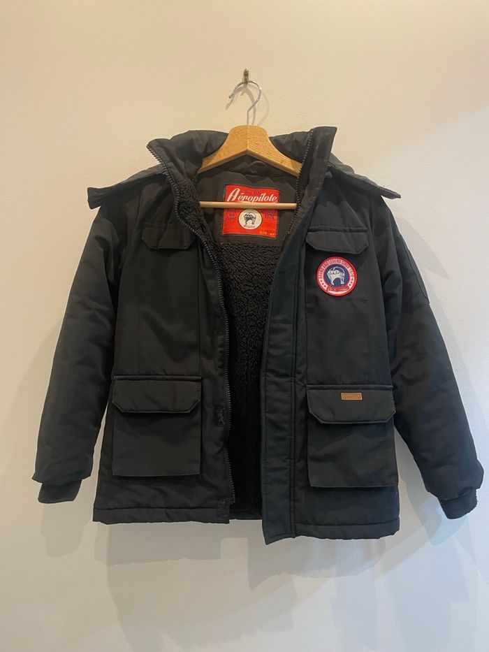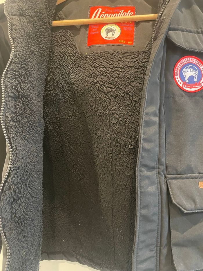 Veste molletonné marque Aéropilote à capuche amovible en très bon état. Taille 8 ans. 4 poches sur le devant avec scratch. Fermeture de la veste avec une tirette et scratch.