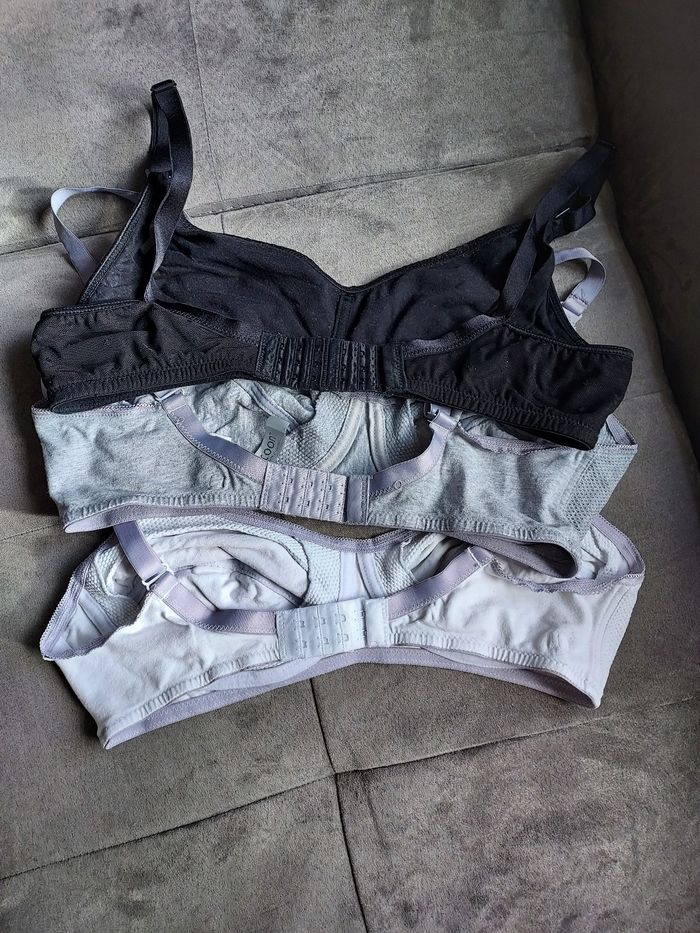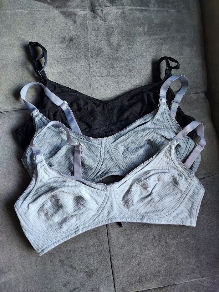 Lot de 3 soutiens gorge d'allaitement taille 90C : 1 gris, 1 noir à motif, 1 blanc de la marque Cocoon de La Redoute