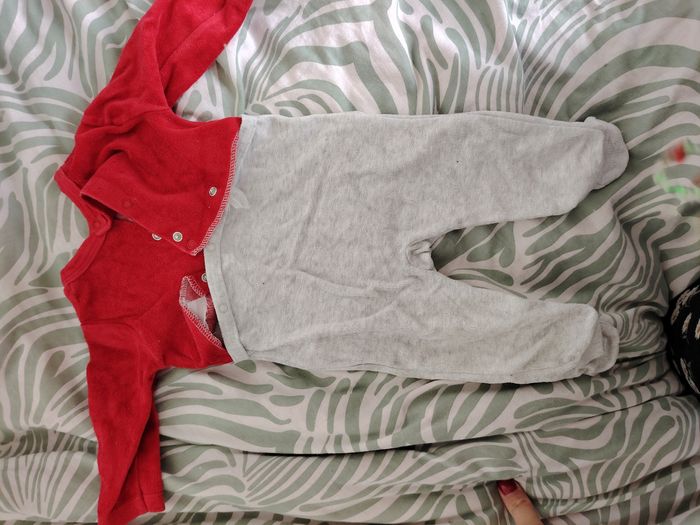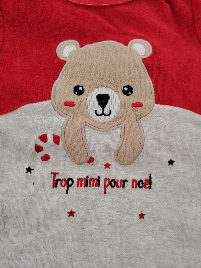 Pyjama sur le thème de Noël rouge et gris avec ours en plein centre de la marque les petits cailloux. En très bon état. C'est une taille 3 mois.