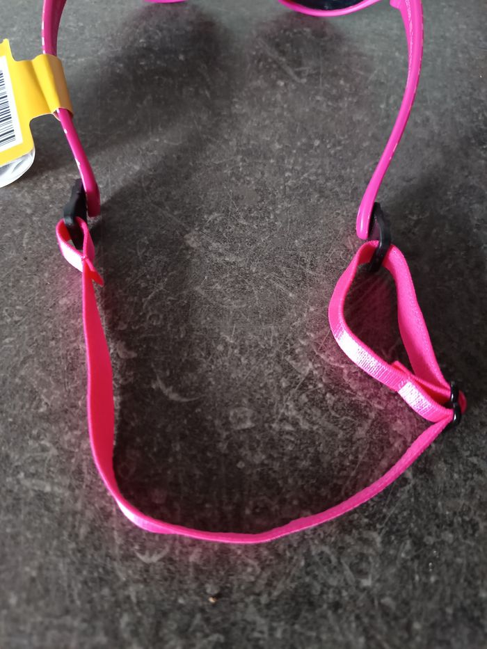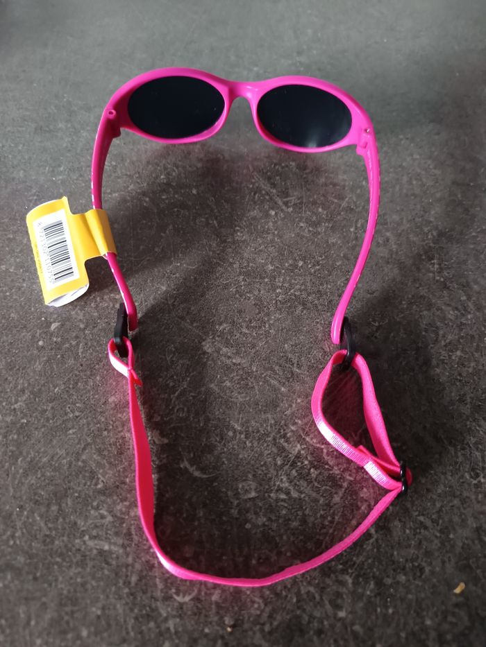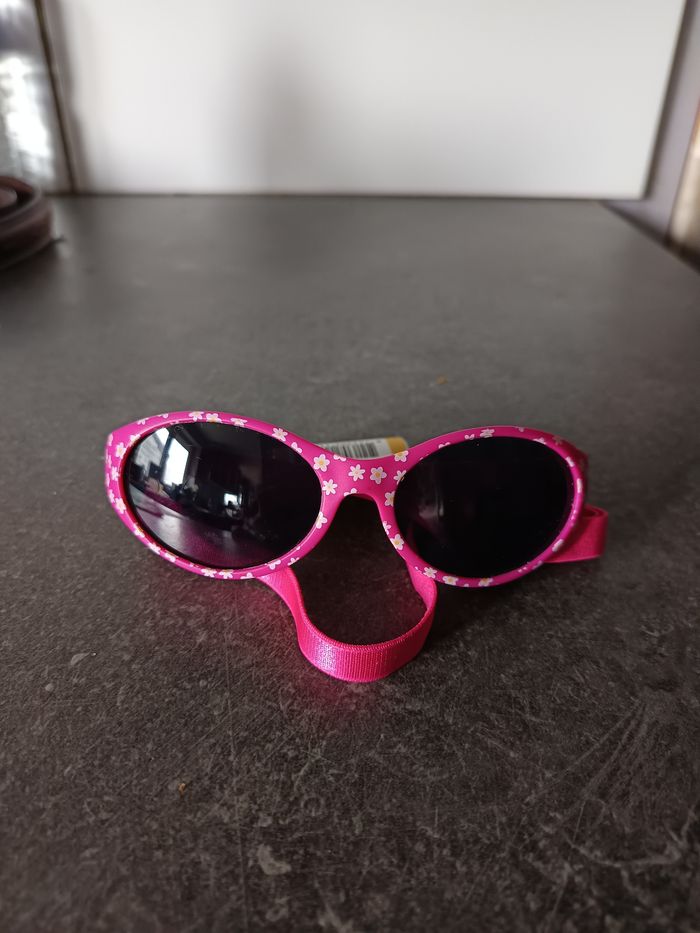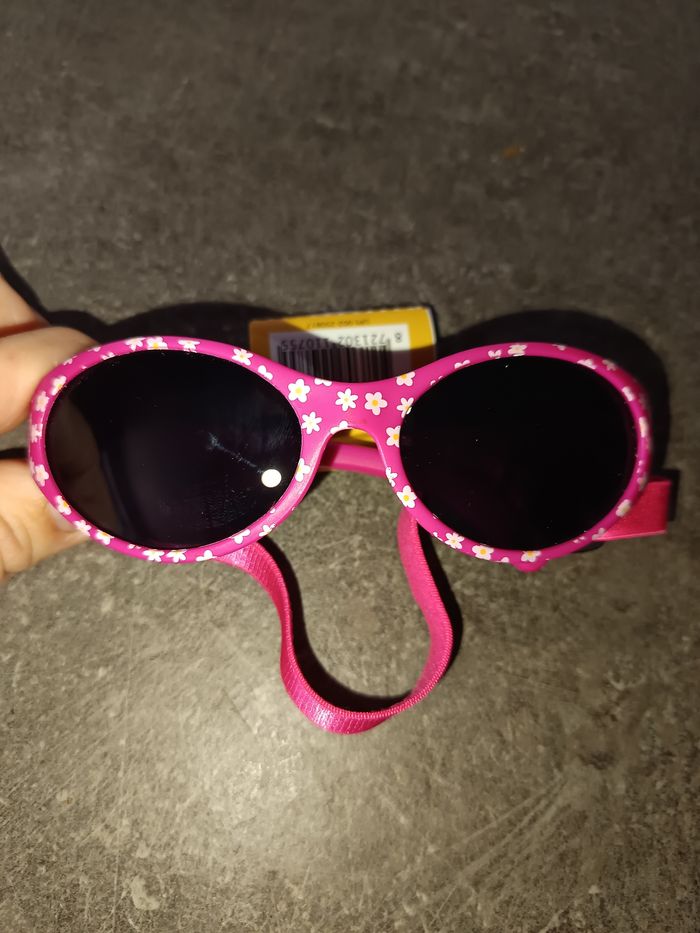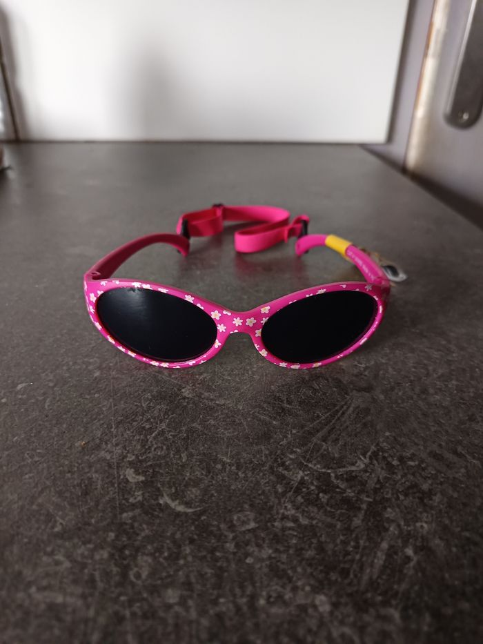 Lunettes de soleil rose avec motifs marguerites, Avec attaches pour éviter qu'elles glissent du nez de bébé. À partir de 1 an je dirai car elles sont larges. NEUVES avec étiquette !