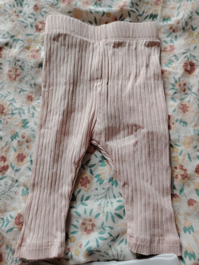 Lot de deux leggings provenants de chez Kiabi en taille 3 mois. Il y a un rose pale et un blanc. En très bon état