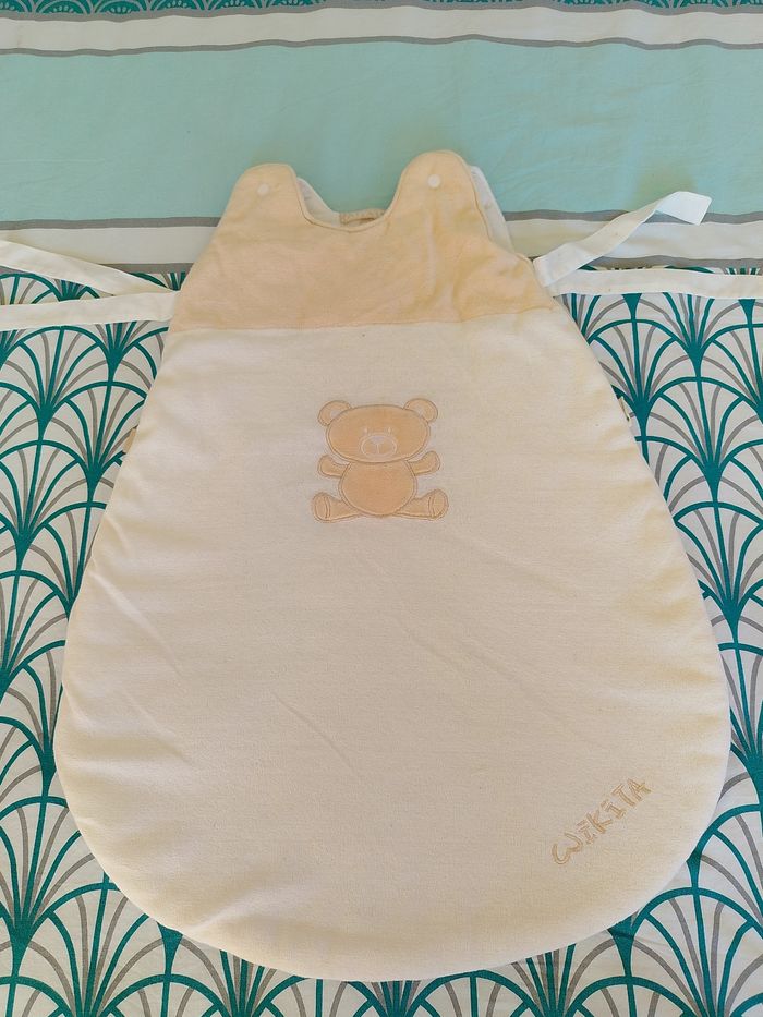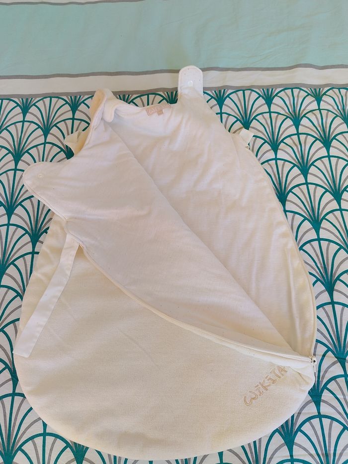 Gigoteuse toute douce 🪷 Longueur totale depuis le col 59 cm. Convient à un enfant de 0 à 6 mois 🩵 Matière toute douce. Sur le haut de l'épaule 2 pressions pour ouvrir facilement, fermeture qui s'ouvre entièrement pour déposer bébé avec délicatesse sans le brusquer 💮 Couleur blanc cassé et beige. En parfait état ! Envoie rapide et soigné ☀️ N'oubliez pas de jeter un œil dans mon dressing. Une autre gigoteuse, bel ours blanc... 😉